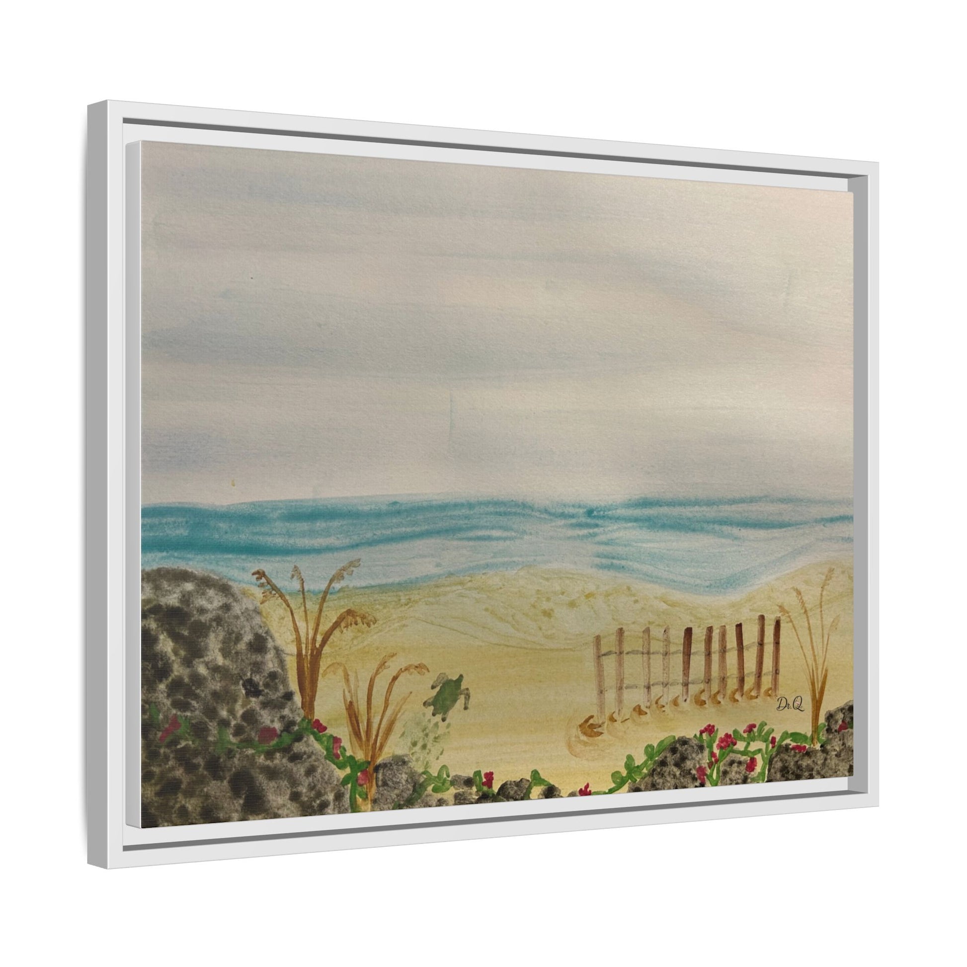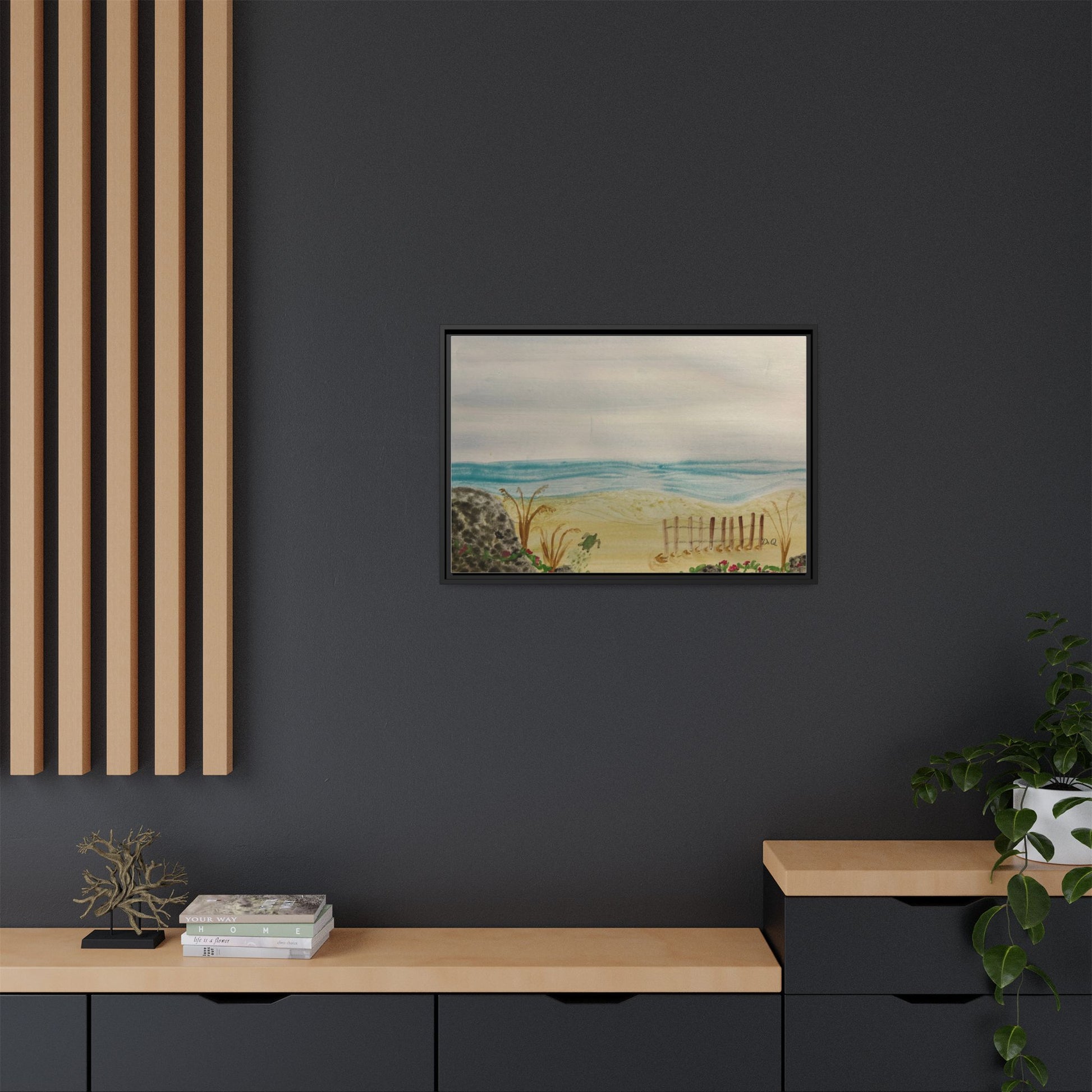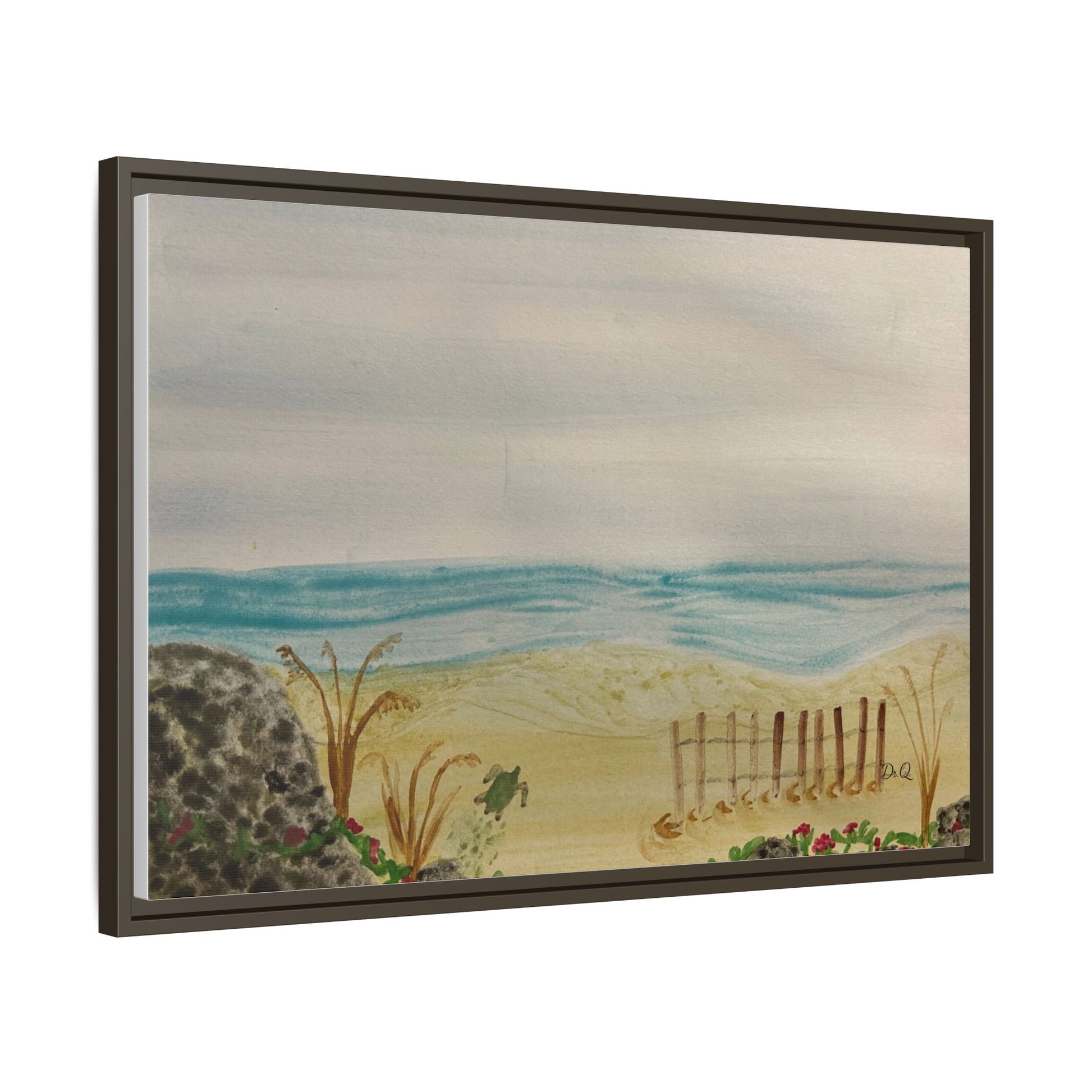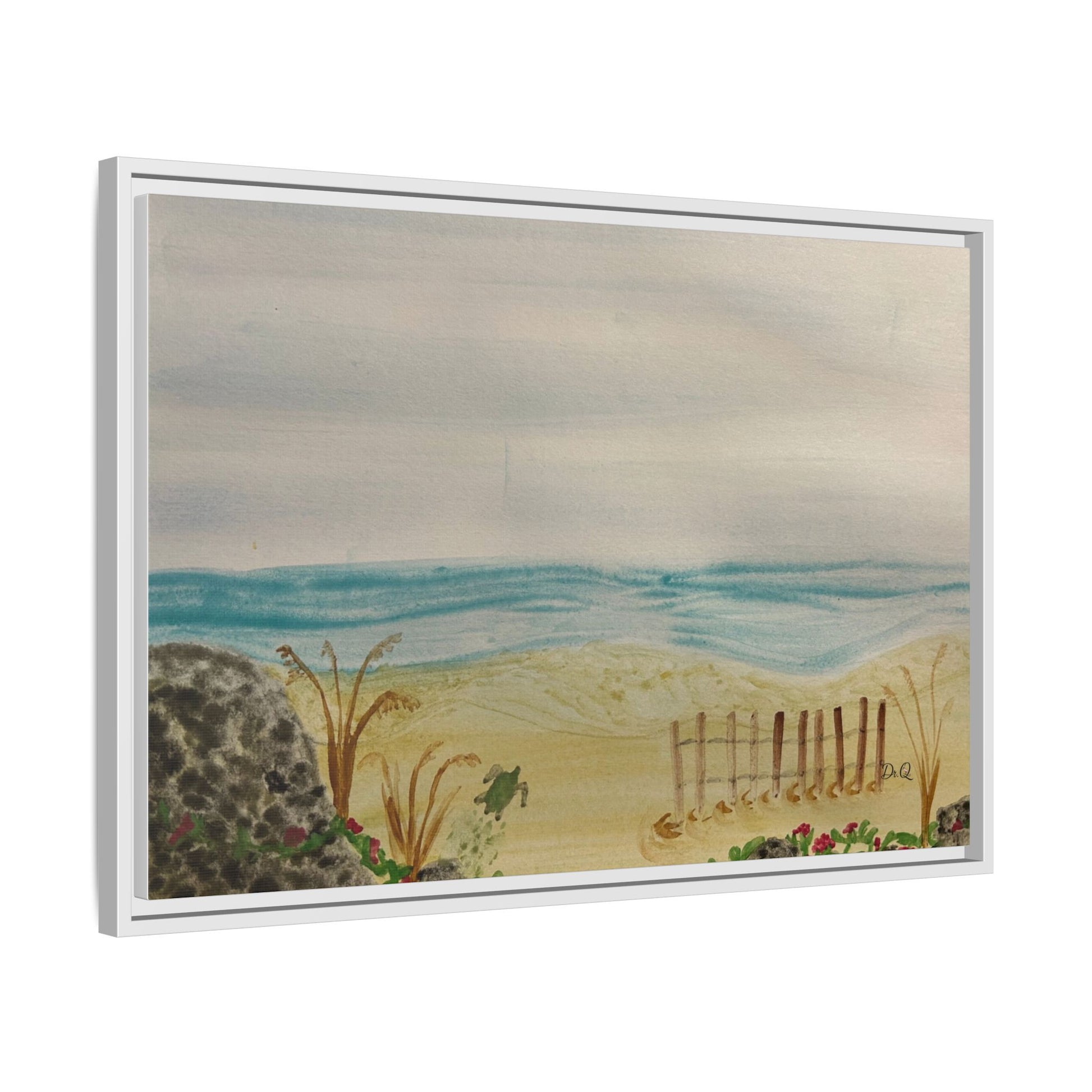 A quietly evocative framed matte canvas that brings the hush of the shoreline into your home. Soft, watercolor-like washes of sea and sky rest above a sandy dune pierced by a weathered fence and tufts of grass. The muted palette and delicate detail create a calm focal point — the kind that invites slow breath and a pause in the day. Hung above a reading nook, in a coastal cottage hallway, or leaning on a mantel, this piece reads like a memory of an early morning beach walk: salt air, cool sand, and the gentle hush of waves just beyond sight.