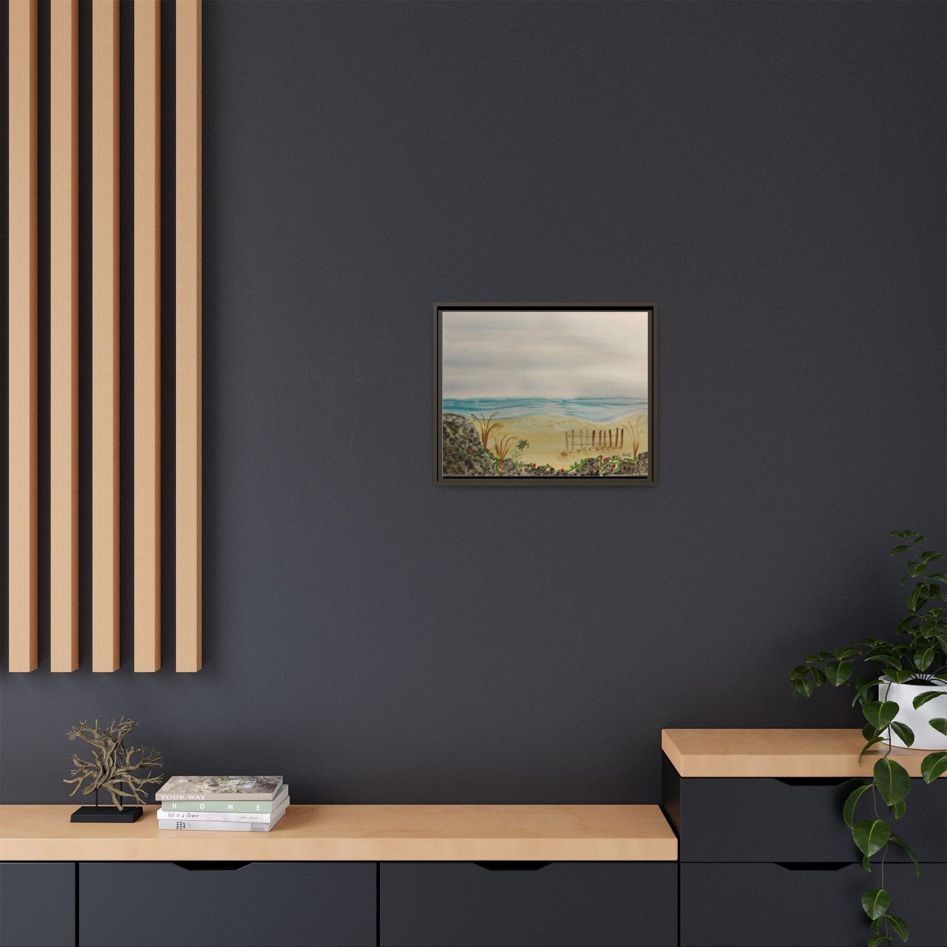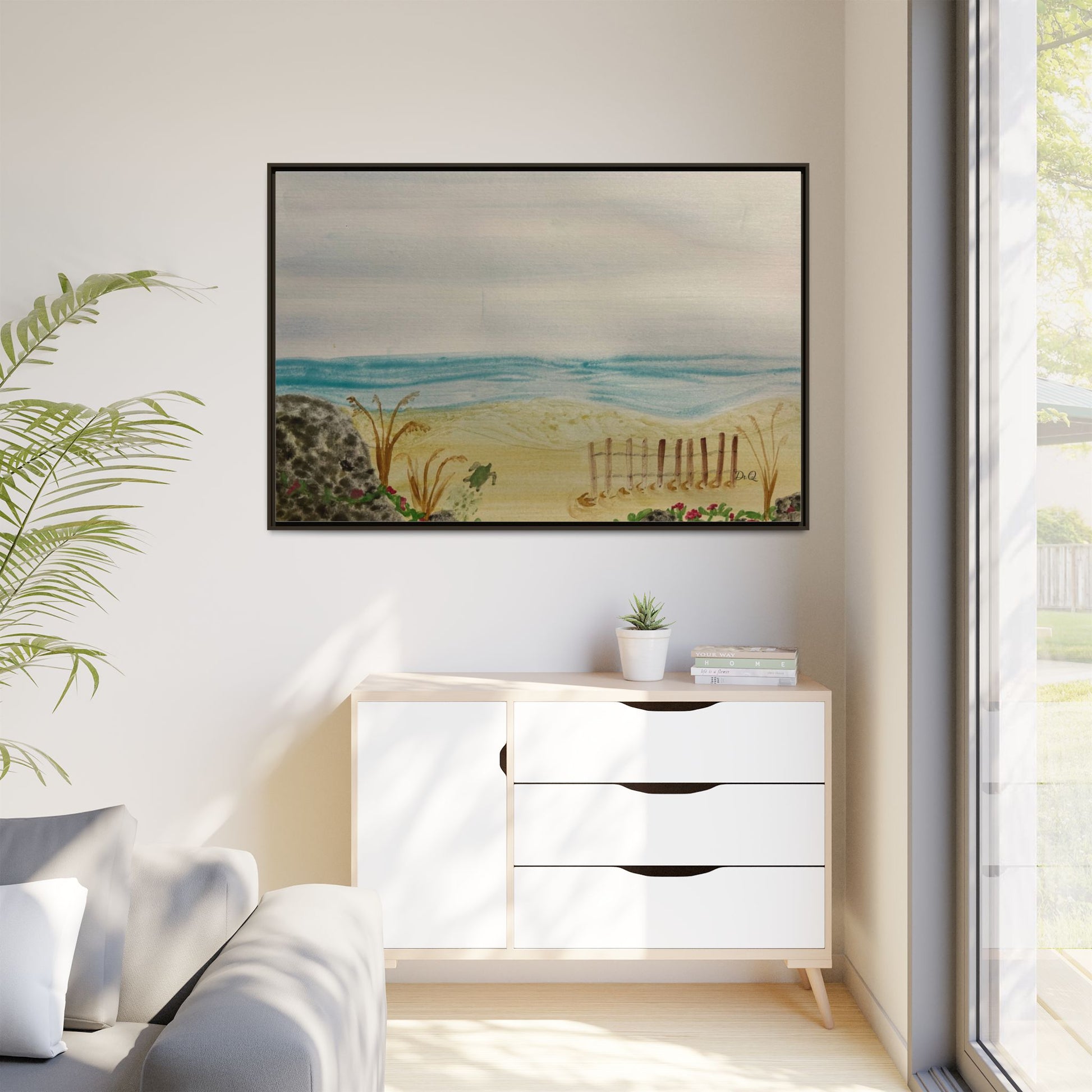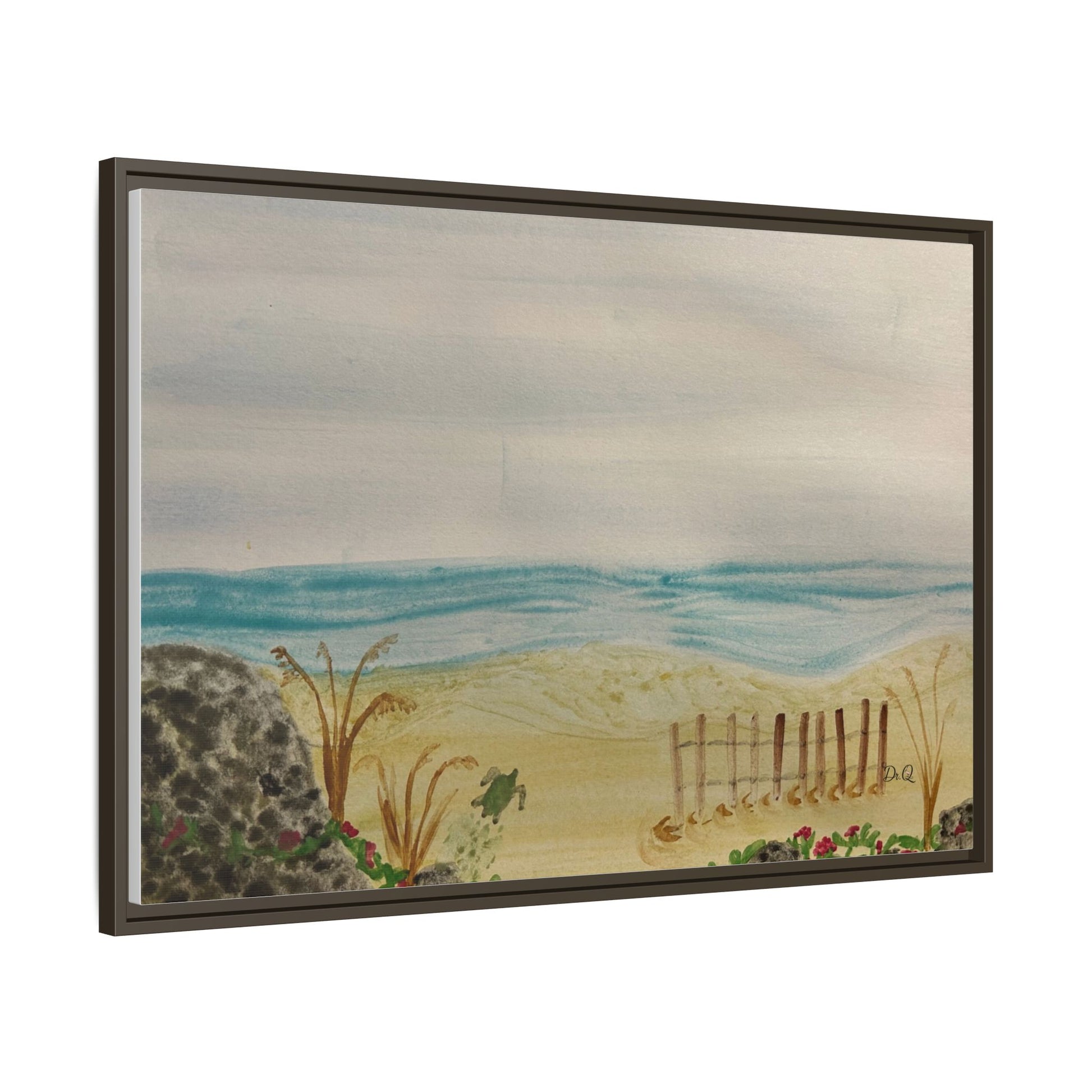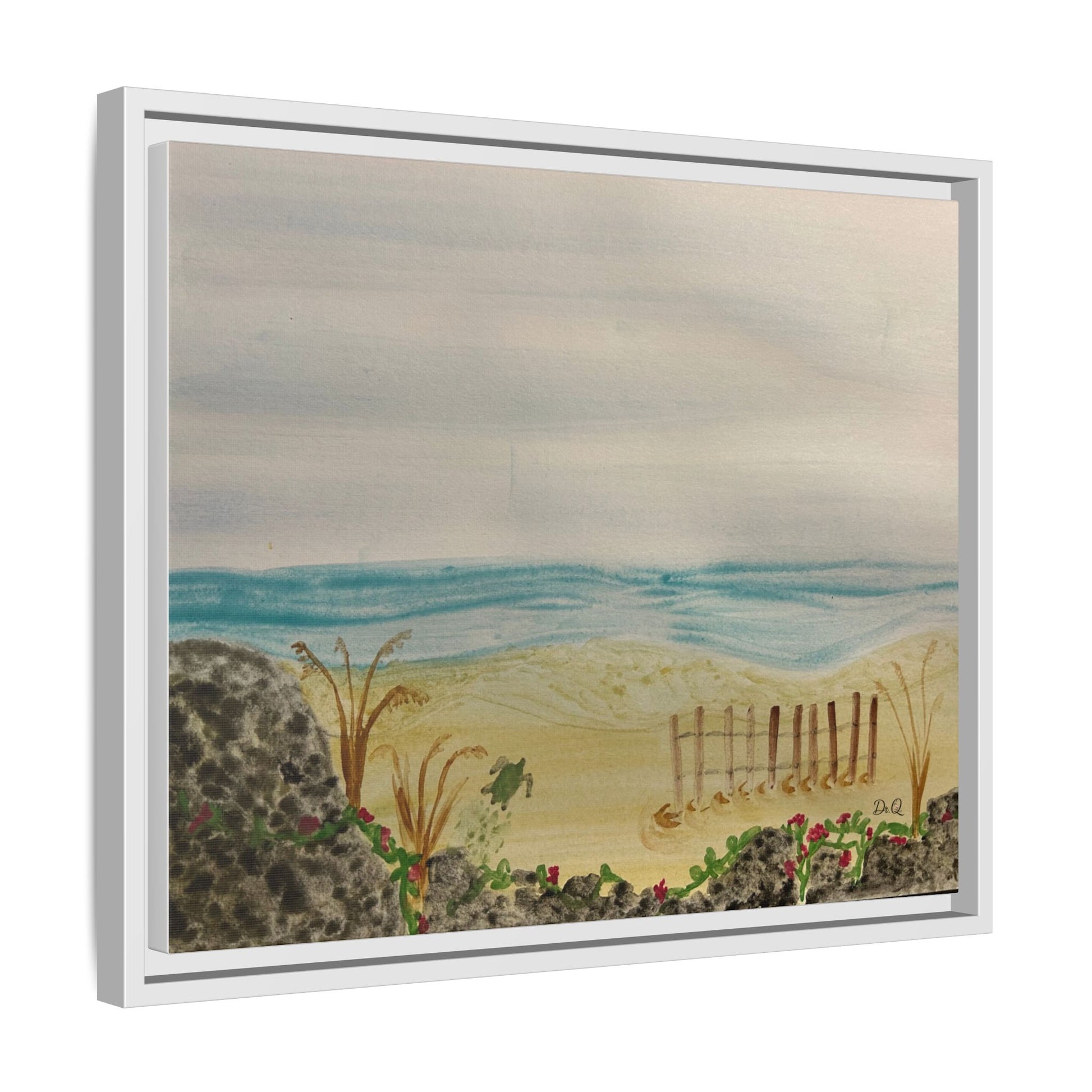 A quietly evocative framed matte canvas that brings the hush of the shoreline into your home. Soft, watercolor-like washes of sea and sky rest above a sandy dune pierced by a weathered fence and tufts of grass. The muted palette and delicate detail create a calm focal point — the kind that invites slow breath and a pause in the day. Hung above a reading nook, in a coastal cottage hallway, or leaning on a mantel, this piece reads like a memory of an early morning beach walk: salt air, cool sand, and the gentle hush of waves just beyond sight.