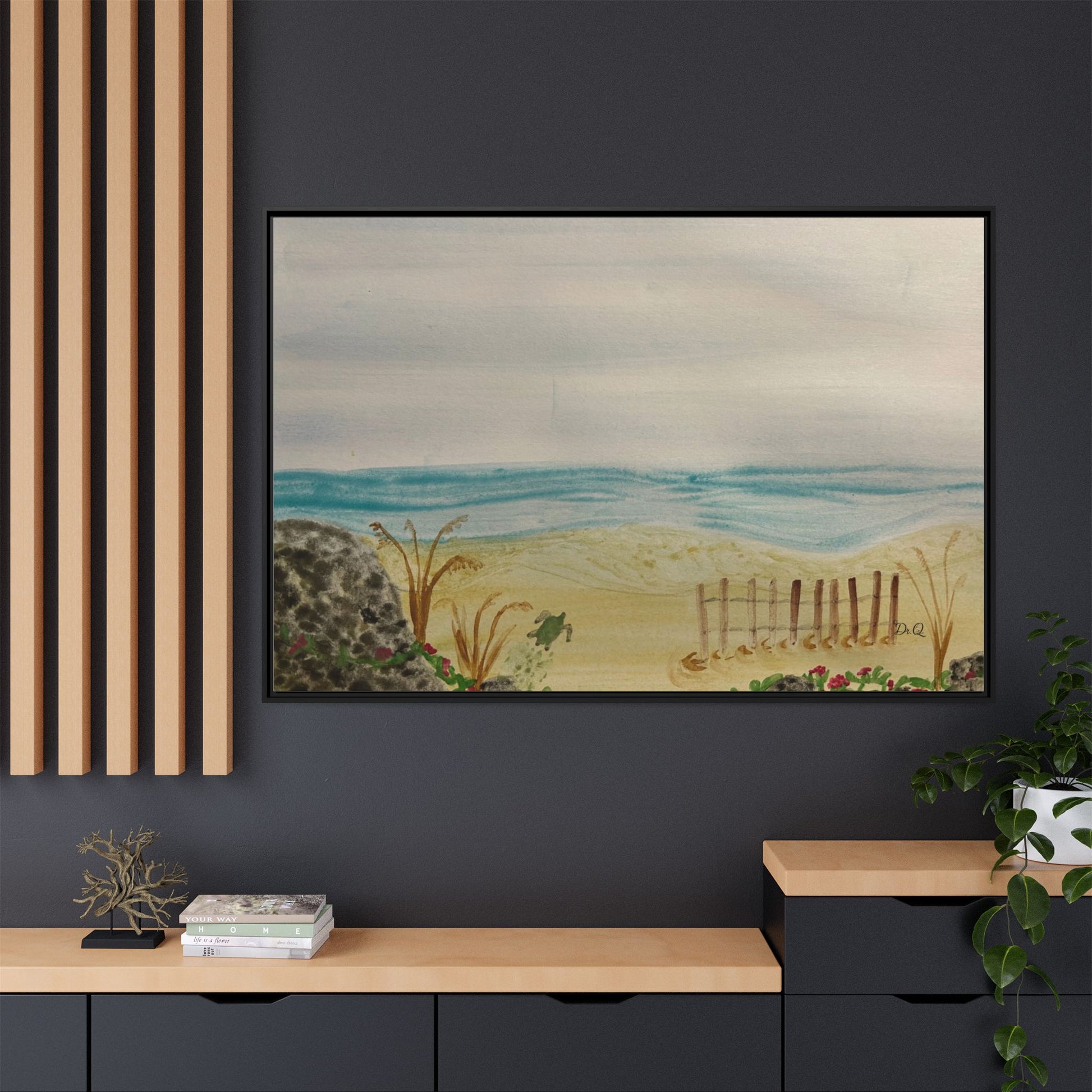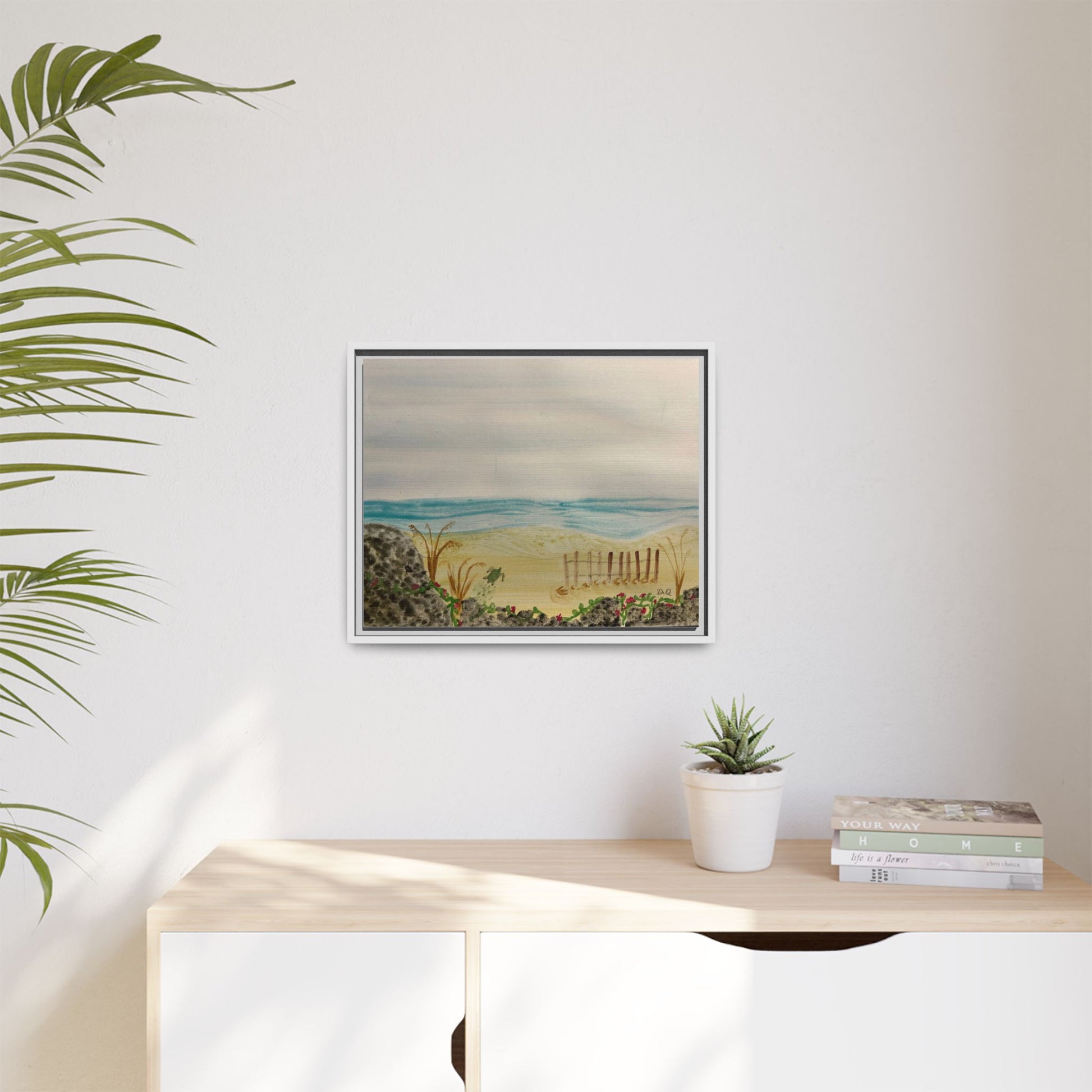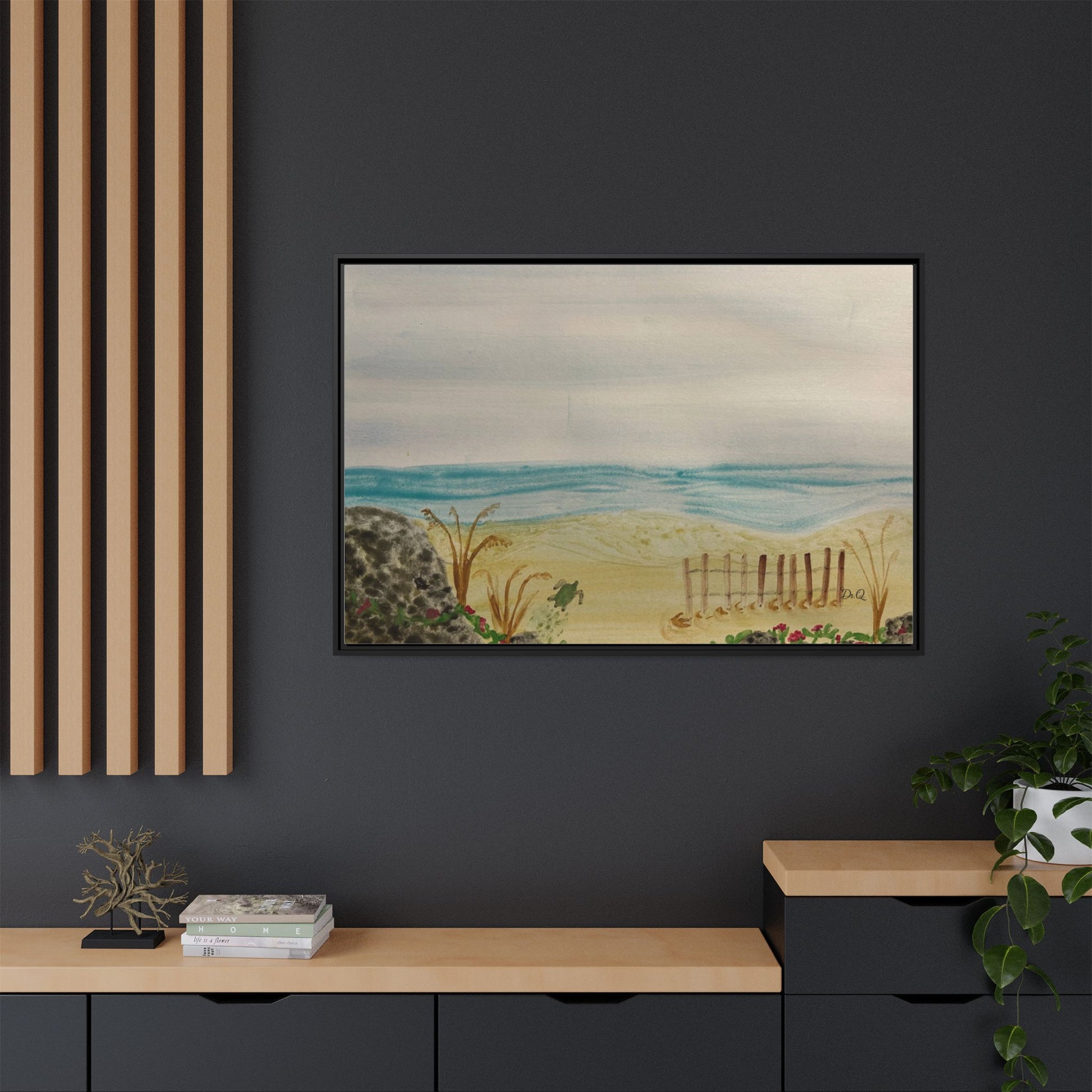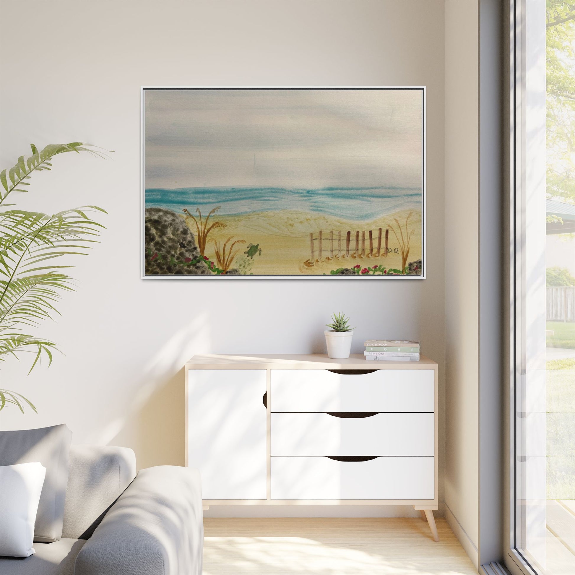 A quietly evocative framed matte canvas that brings the hush of the shoreline into your home. Soft, watercolor-like washes of sea and sky rest above a sandy dune pierced by a weathered fence and tufts of grass. The muted palette and delicate detail create a calm focal point — the kind that invites slow breath and a pause in the day. Hung above a reading nook, in a coastal cottage hallway, or leaning on a mantel, this piece reads like a memory of an early morning beach walk: salt air, cool sand, and the gentle hush of waves just beyond sight.