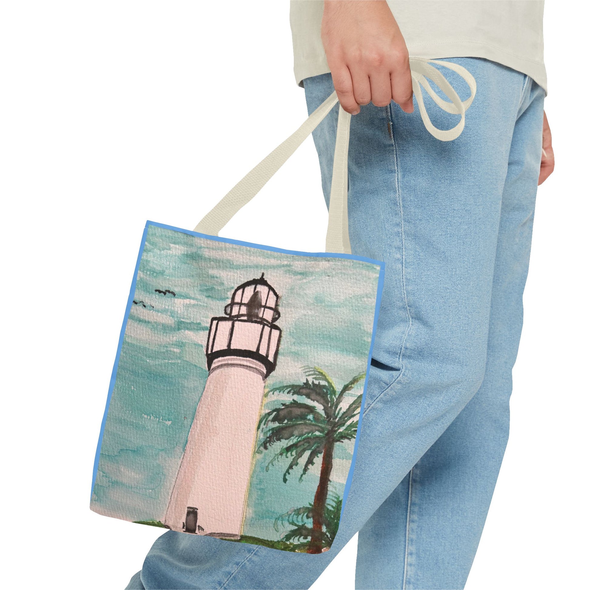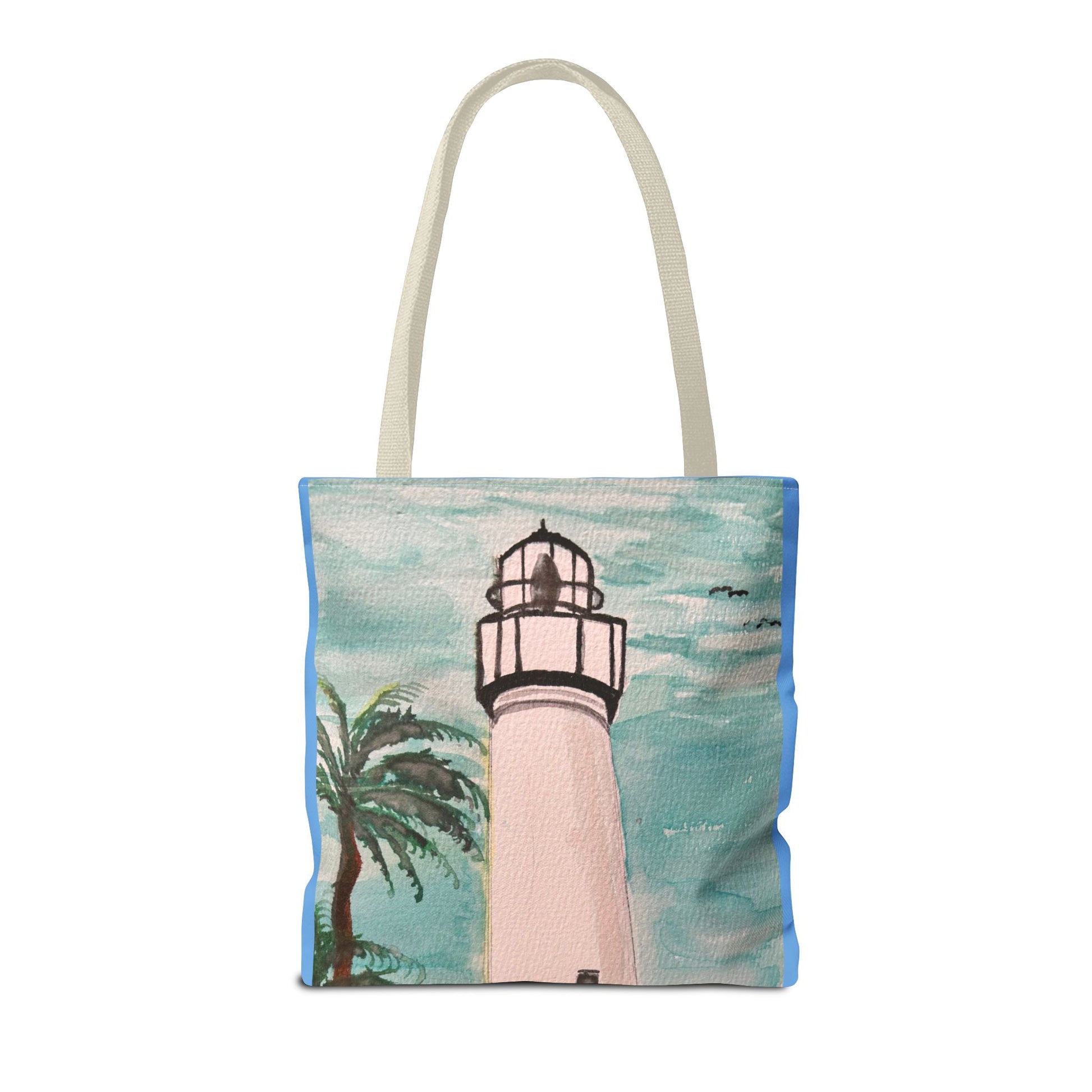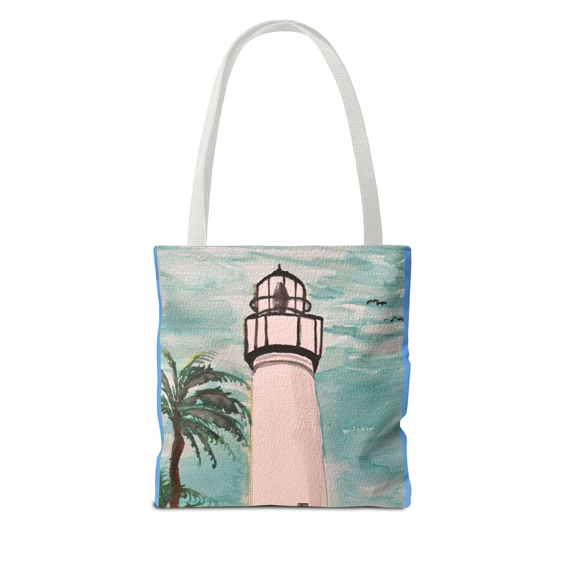 A soft, painterly lighthouse print on a durable everyday tote that brings a seaside breeze to errands and afternoons out. The watercolor-style sky and swaying palm frame a tall, timeless lighthouse—subtle, calm, and quietly optimistic. Lightweight yet sturdy, this tote holds groceries, art supplies, or a beach towel without losing shape. Carry it to the farmer’s market, a coastal walk, or tucked alongside your sketchbook for an inspired day. The artful colors age gracefully and pair easily with denim, linen, or a sun hat—made to feel like a small coastal escape wherever you go.