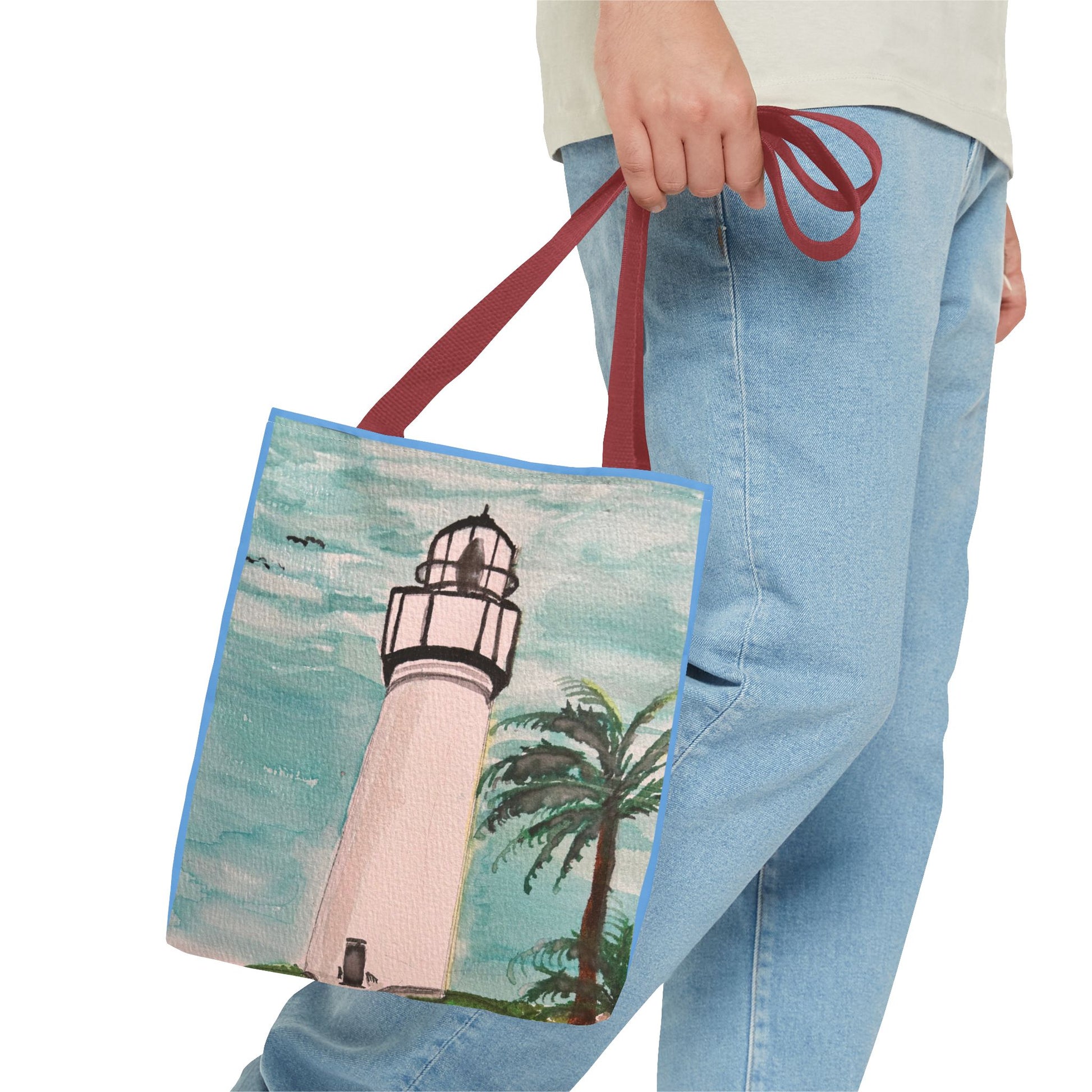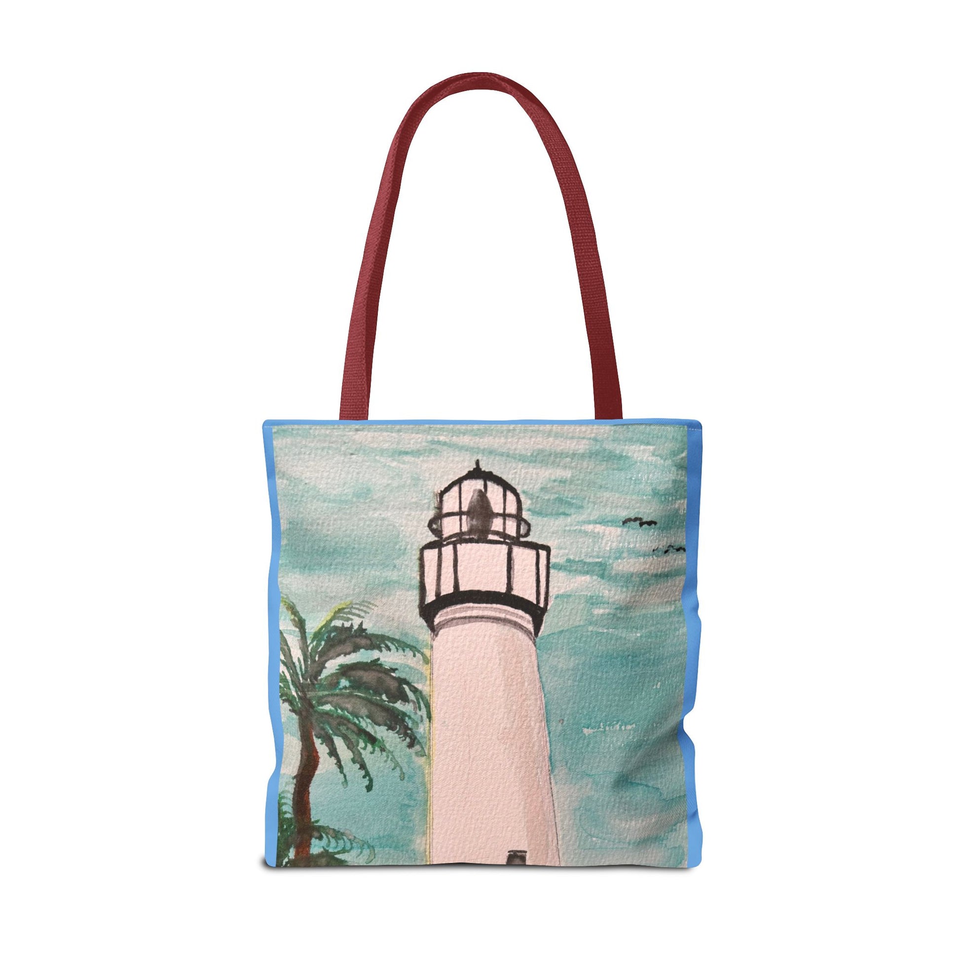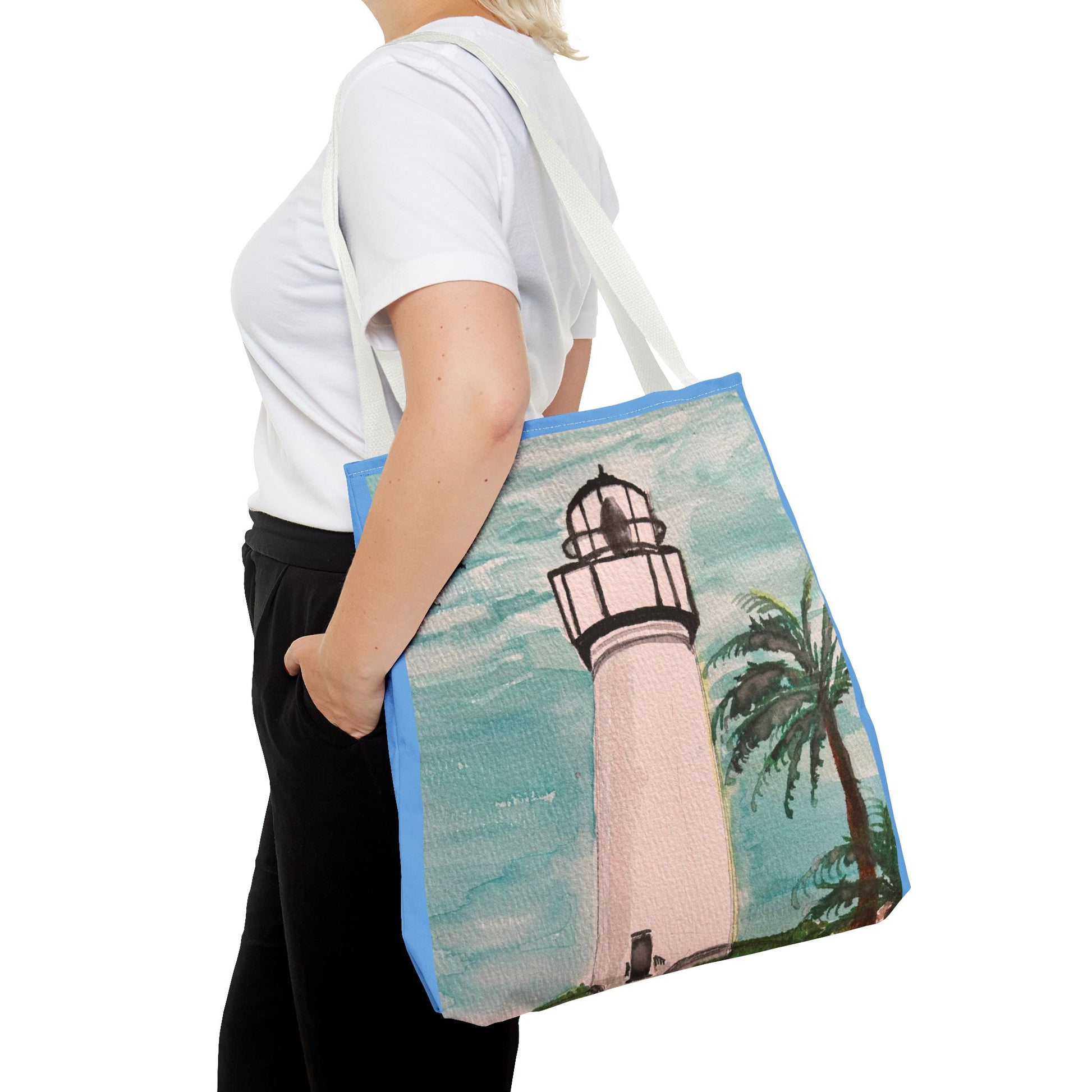 A soft, painterly lighthouse print on a durable everyday tote that brings a seaside breeze to errands and afternoons out. The watercolor-style sky and swaying palm frame a tall, timeless lighthouse—subtle, calm, and quietly optimistic. Lightweight yet sturdy, this tote holds groceries, art supplies, or a beach towel without losing shape. Carry it to the farmer’s market, a coastal walk, or tucked alongside your sketchbook for an inspired day. The artful colors age gracefully and pair easily with denim, linen, or a sun hat—made to feel like a small coastal escape wherever you go.