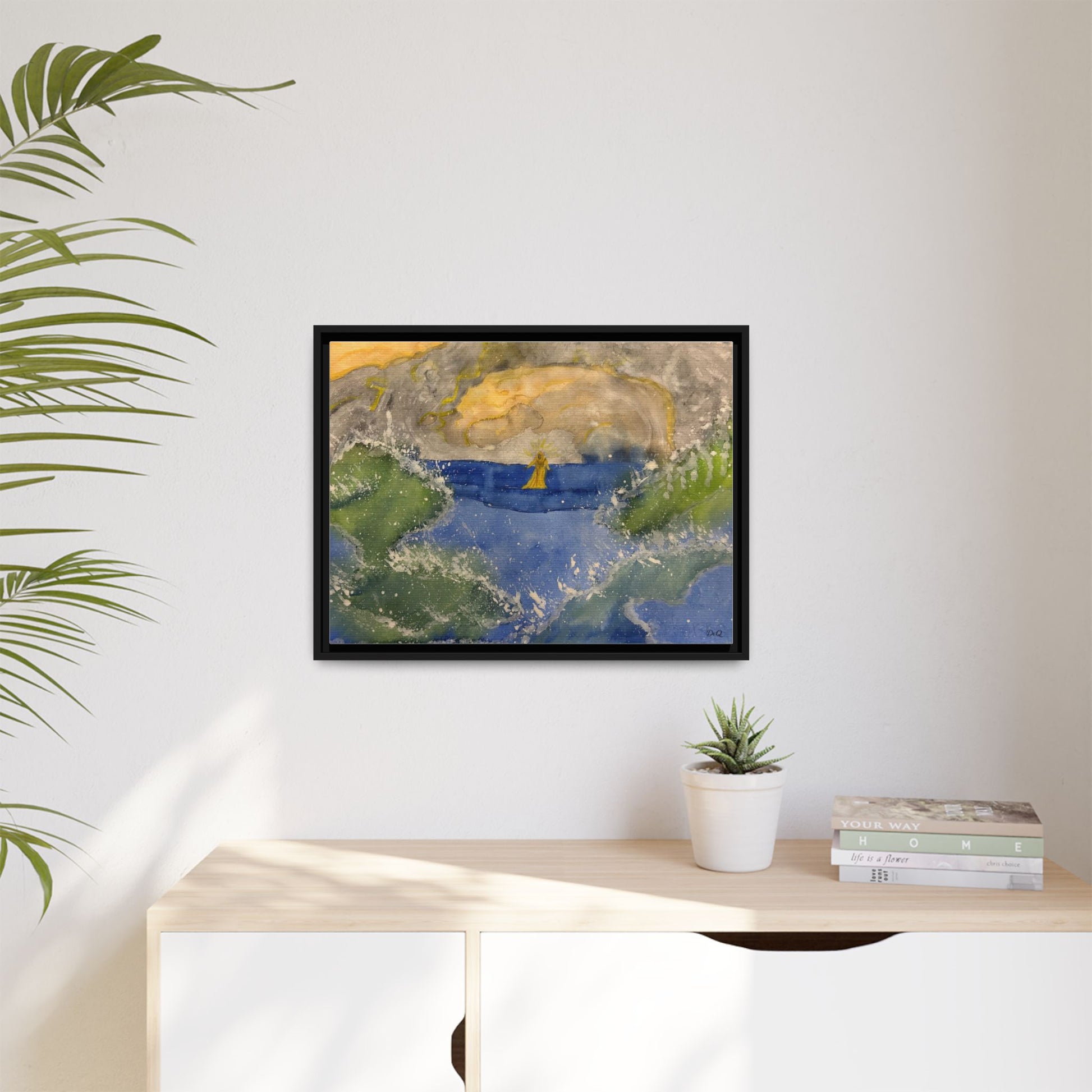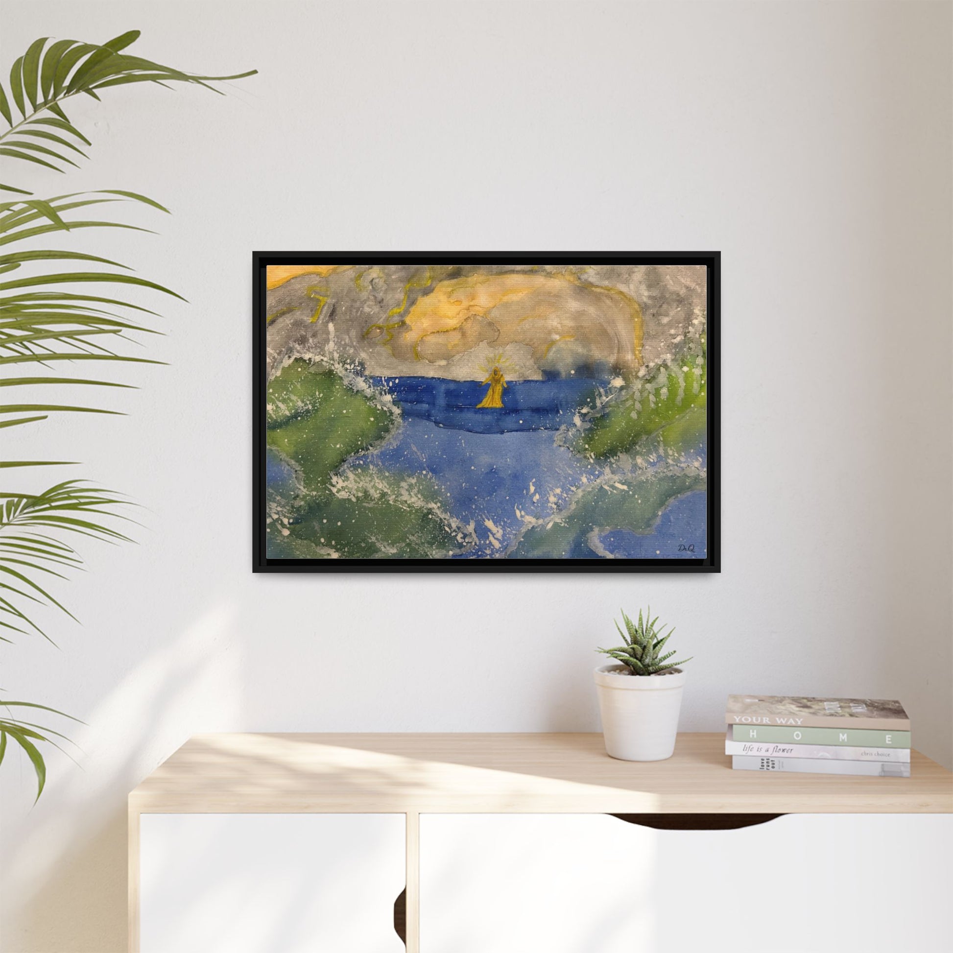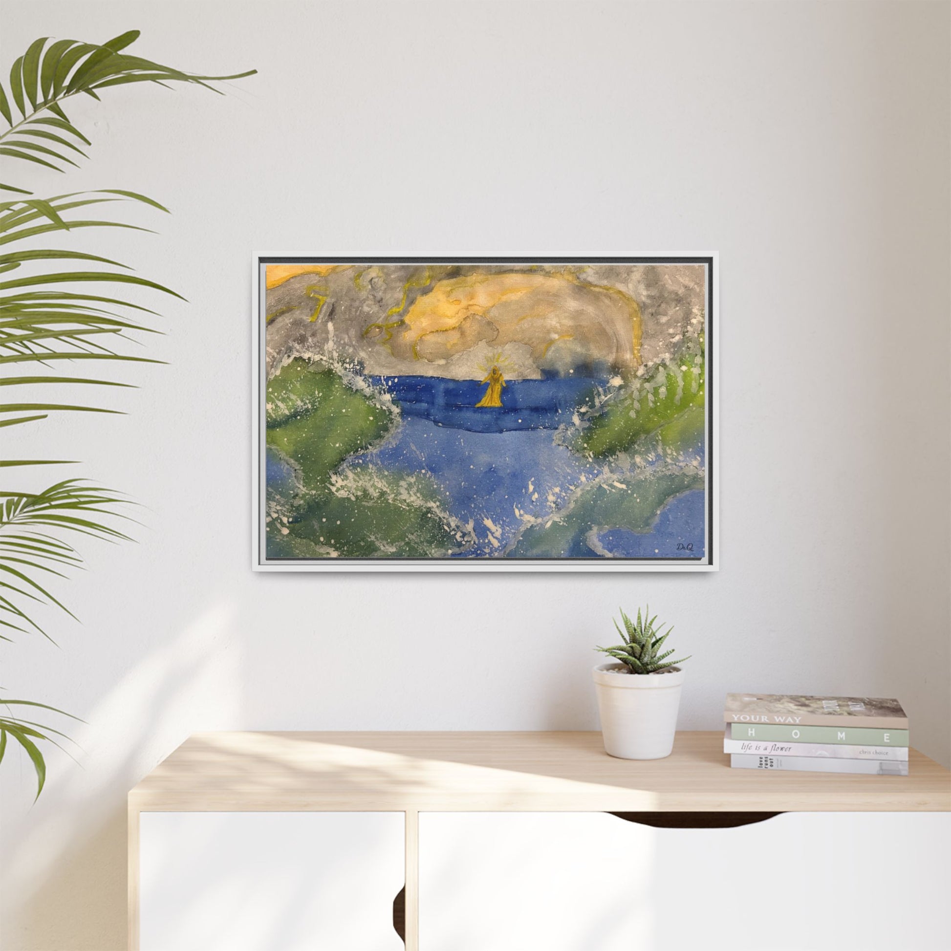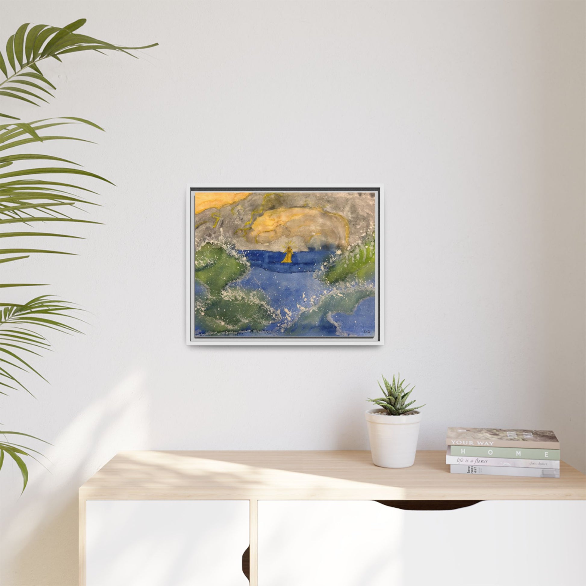 Bring a quiet, sea-side reverie into your room with this "Faith in the Storm" matte canvas print. Soft washes of blue and green ripple like watercolor waves, while a distant yellow lighthouse glows under storm-tinted clouds. The framed edge gives the artwork a clean, gallery-ready presence — an intimate window to a small, contemplative scene that invites slower mornings, lingering evenings, and thoughtful pauses between busy days. Hang it where you drink your coffee, read by lamplight, or want a reminder of calm horizons.