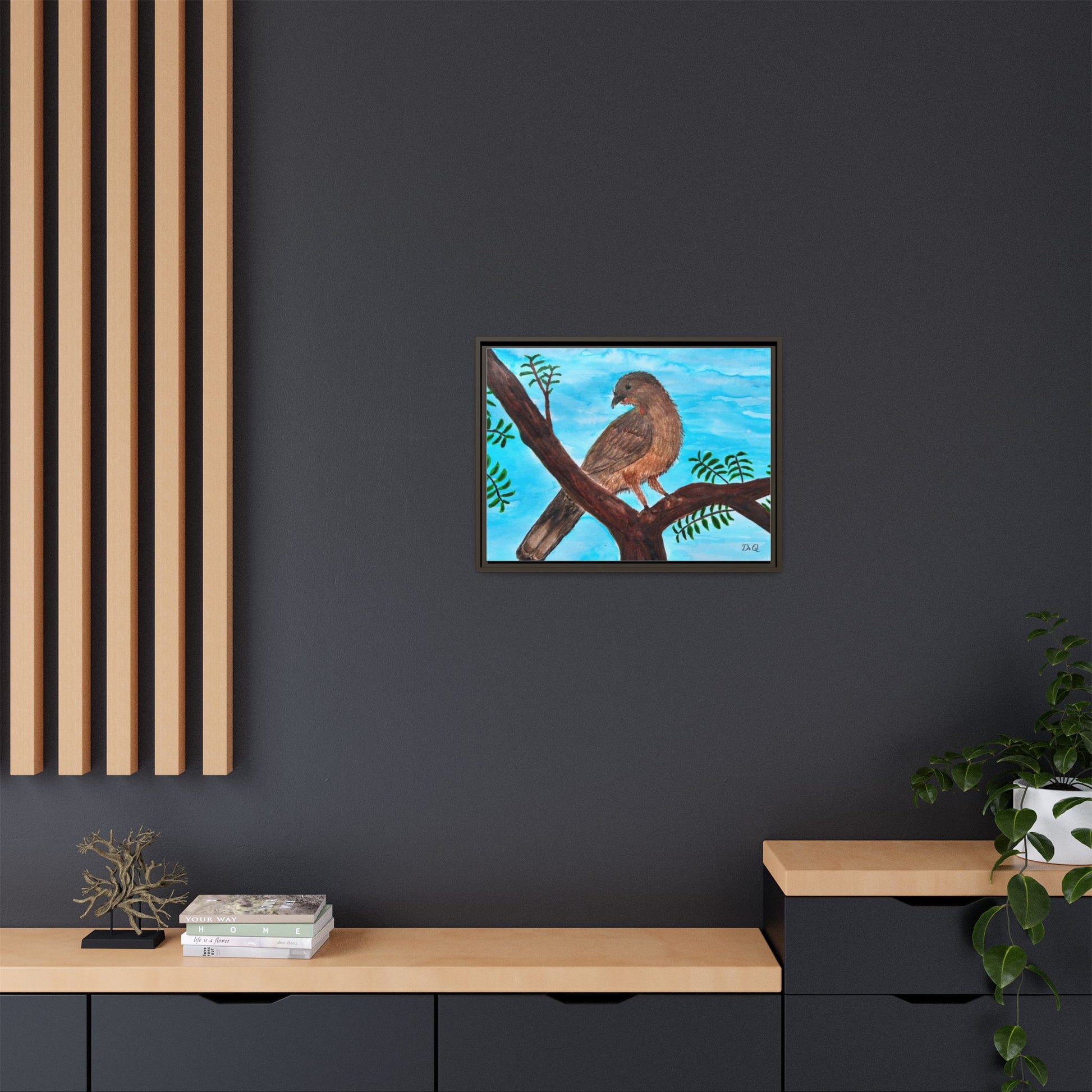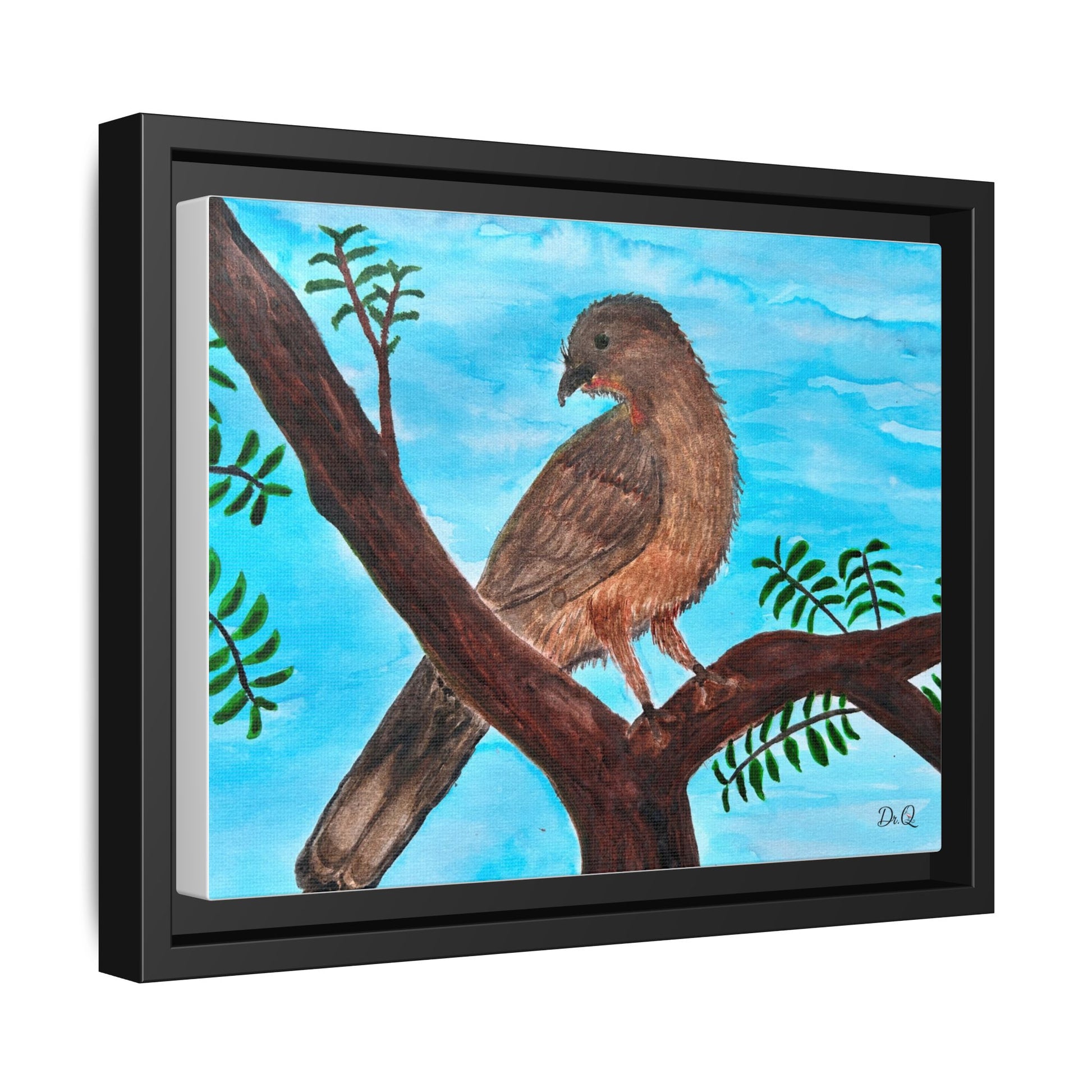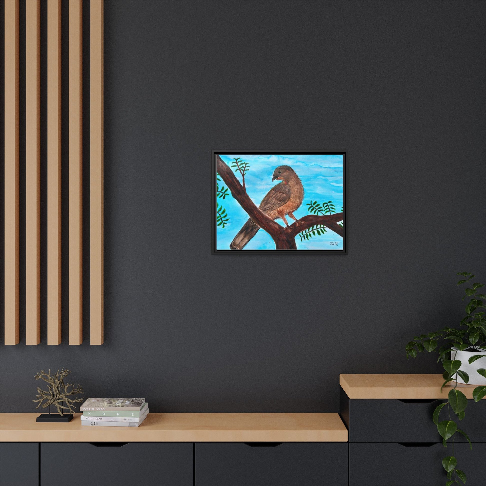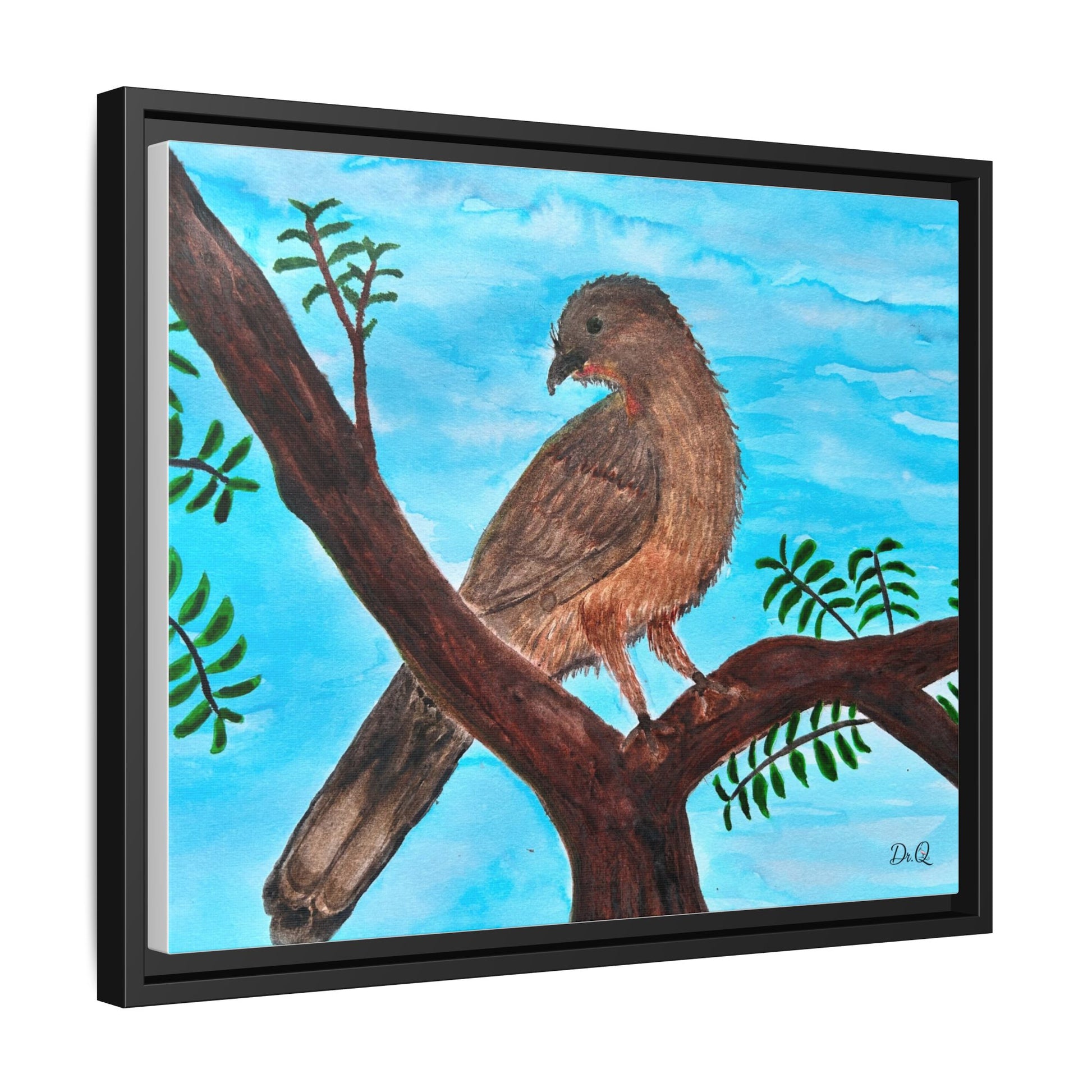 This framed matte canvas brings a quiet moment of nature into the room. A warm Chachalaca bird perches on a branch against a wash of sky-blue, rendered with soft brushstrokes and careful texture that feels hand-painted in watercolor. The slim black frame and muted matte finish let the artwork breathe on the wall while giving it a tidy, gallery-ready presence. It slips easily into living rooms, reading nooks, or a sunlit hallway, where the peaceful bird and gentle foliage invite calm and a closer look.