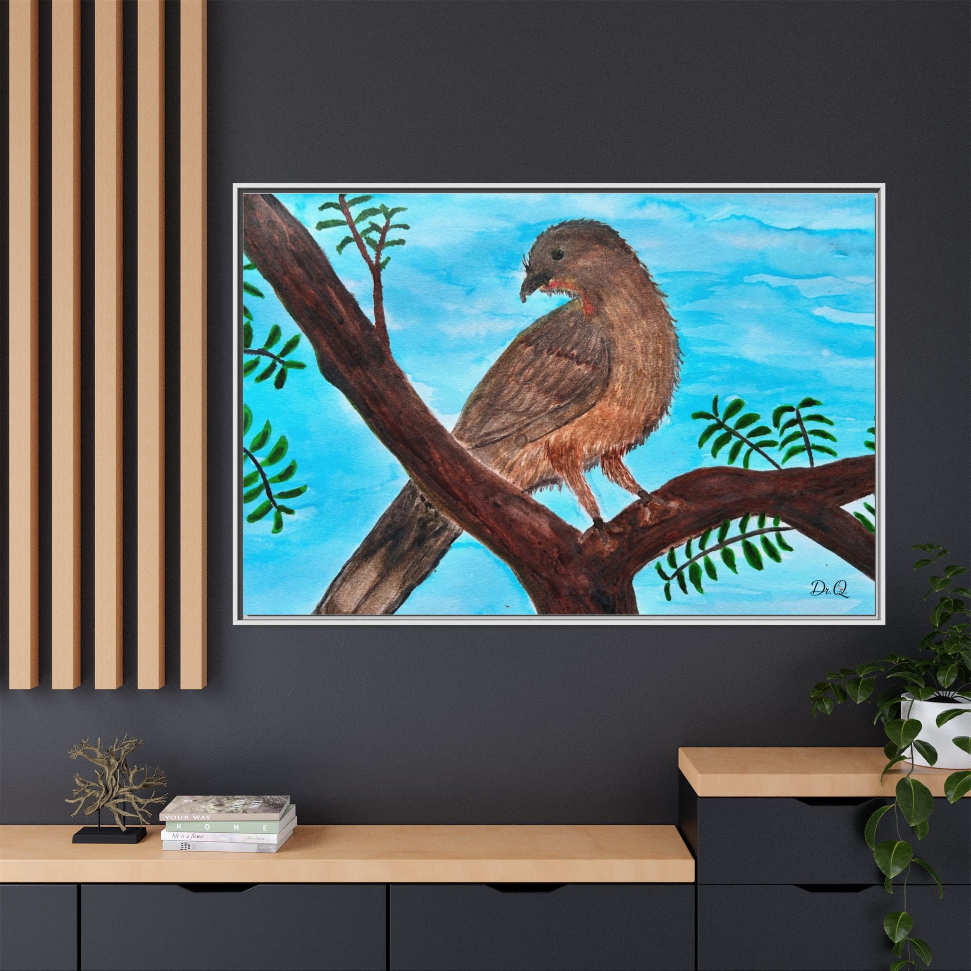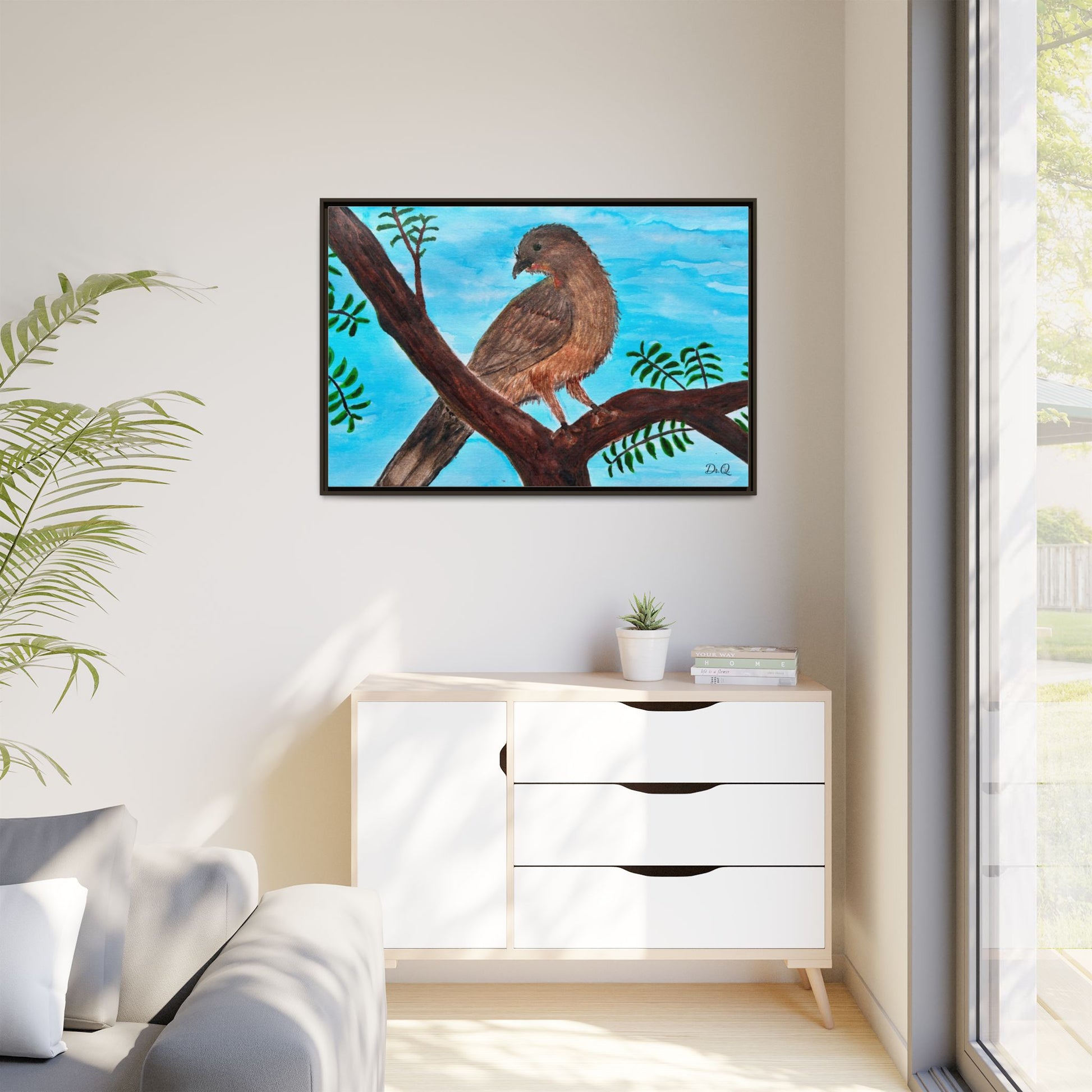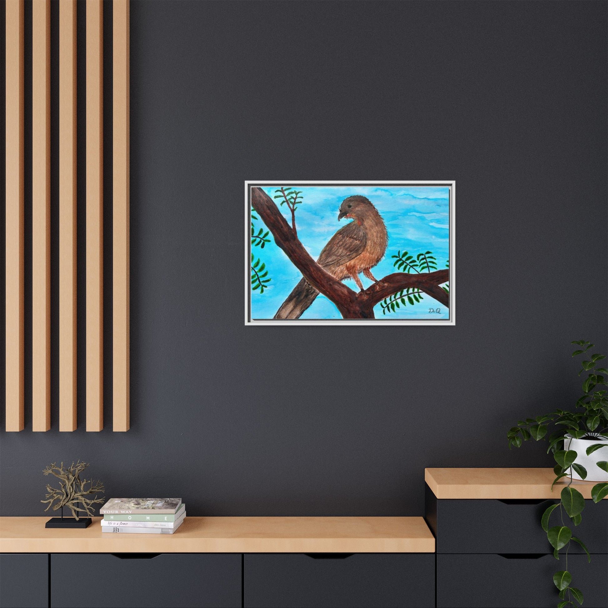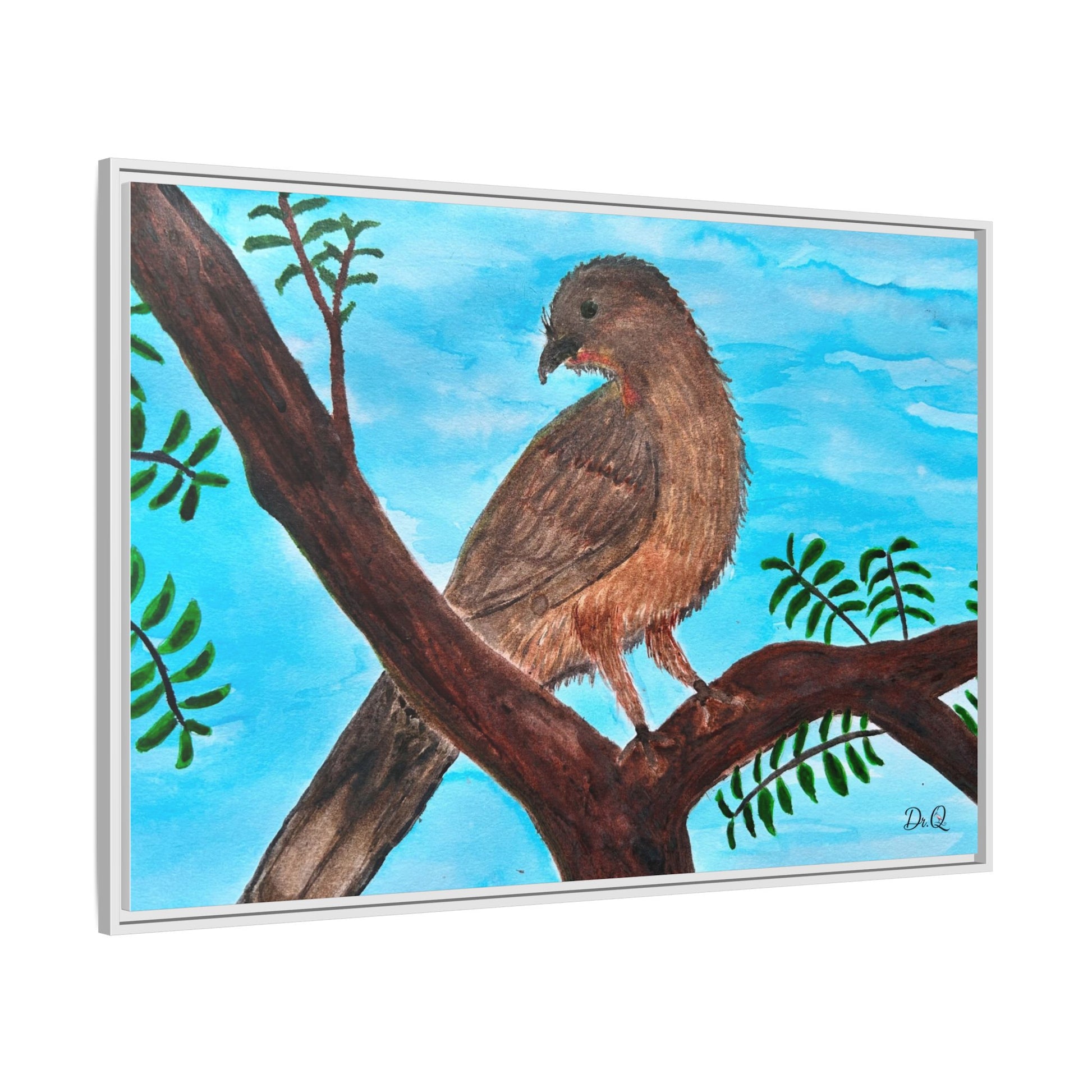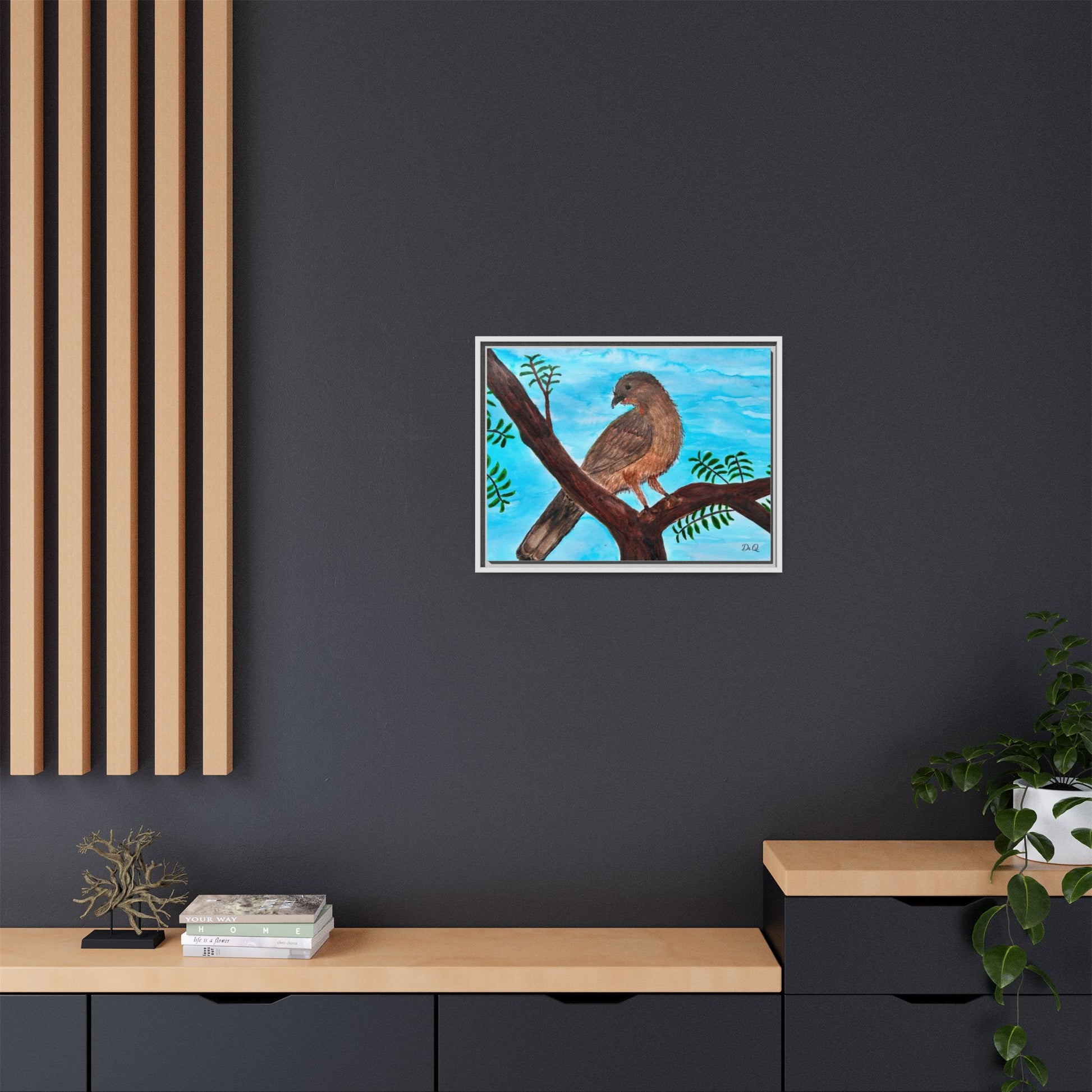 This framed matte canvas brings a quiet moment of nature into the room. A warm Chachalaca bird perches on a branch against a wash of sky-blue, rendered with soft brushstrokes and careful texture that feels hand-painted in watercolor. The slim black frame and muted matte finish let the artwork breathe on the wall while giving it a tidy, gallery-ready presence. It slips easily into living rooms, reading nooks, or a sunlit hallway, where the peaceful bird and gentle foliage invite calm and a closer look.
