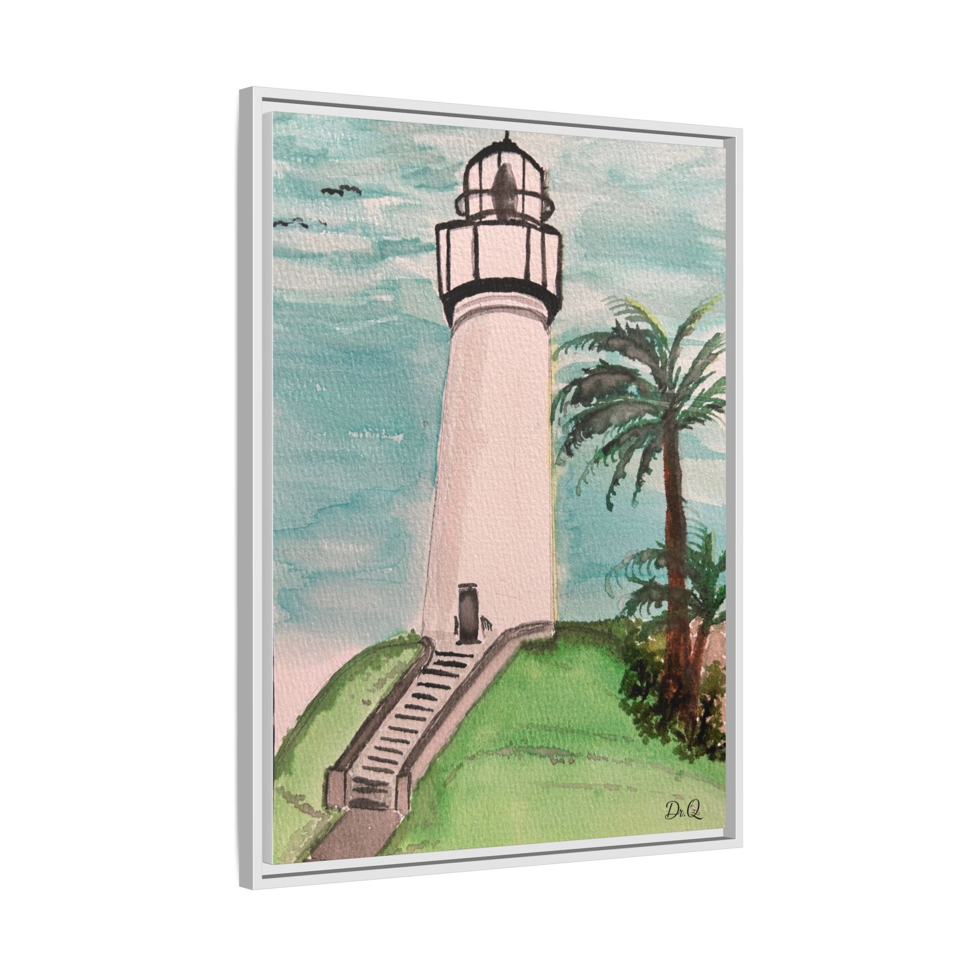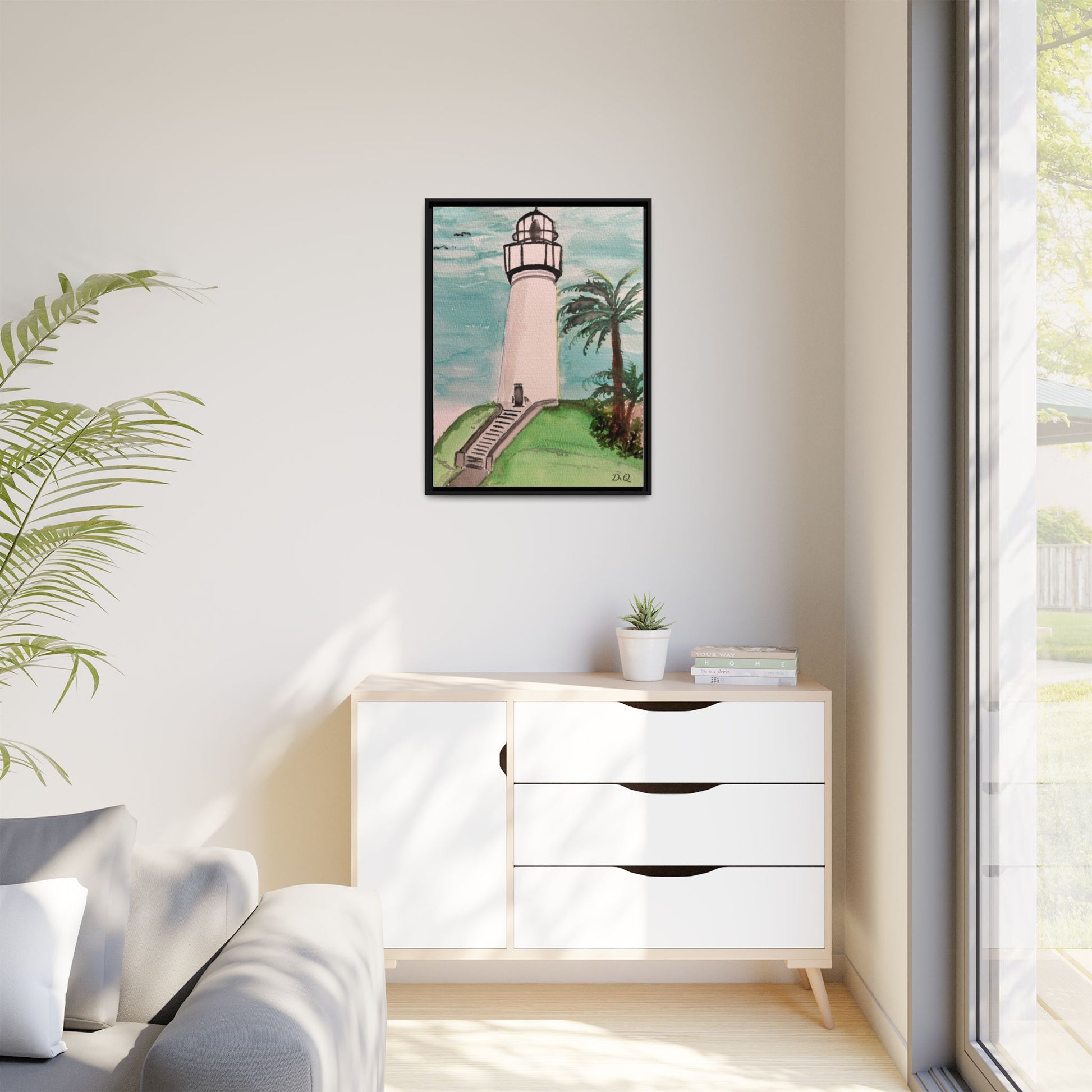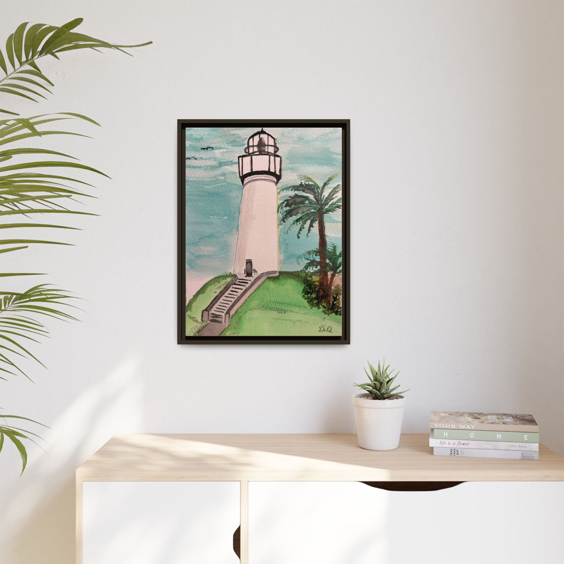 A matte canvas print framed in streamlined pine, this piece brings coastal calm into any room. Soft watercolor washes form a lighthouse standing against a turquoise sky, palms bending in a gentle breeze. The textured canvas and rich, Greenguard Gold–certified inks keep colors lively while the black frame gives the artwork quiet structure. Hang it over a reading nook, entryway, or beach-house wall to evoke slow afternoons and salt-sweet air.