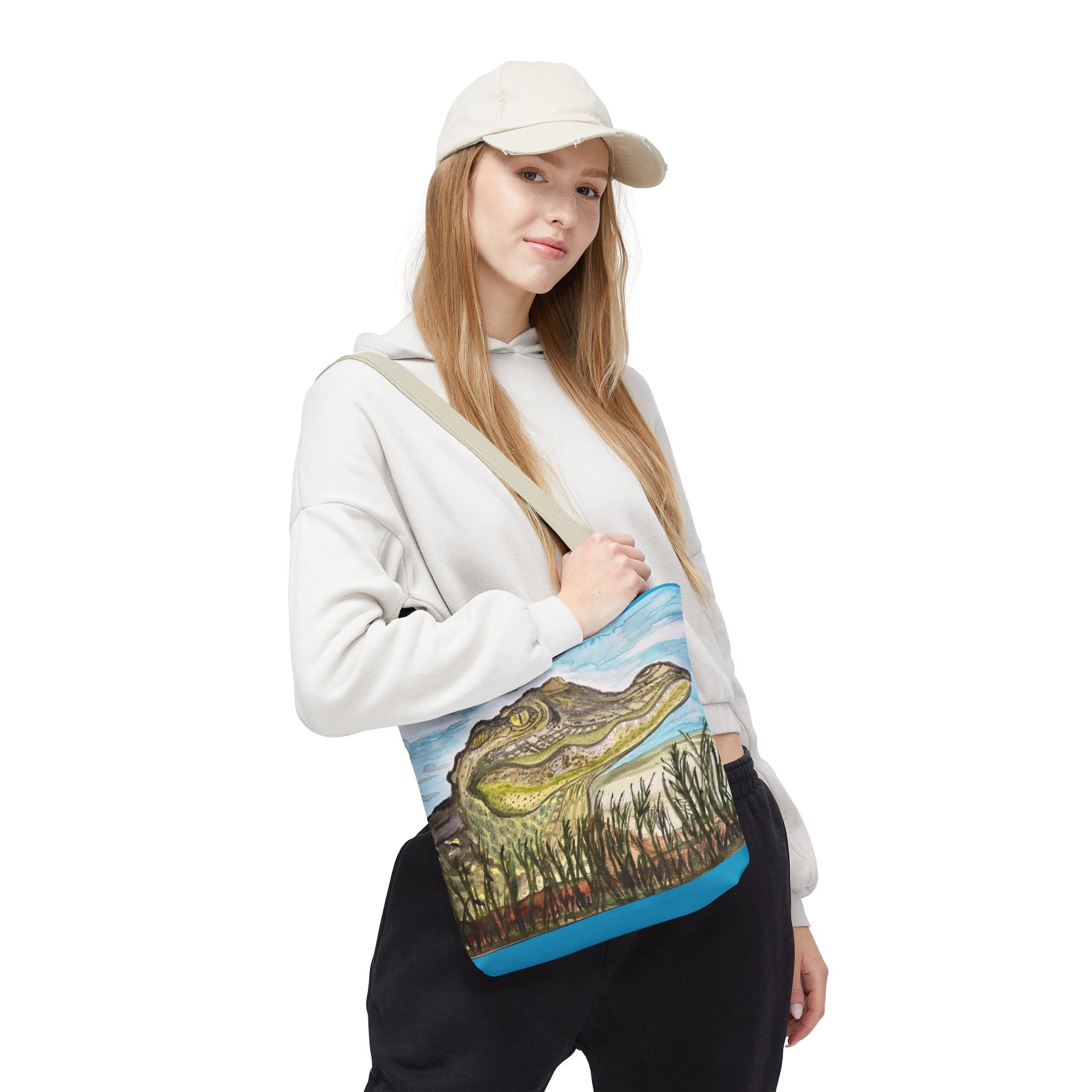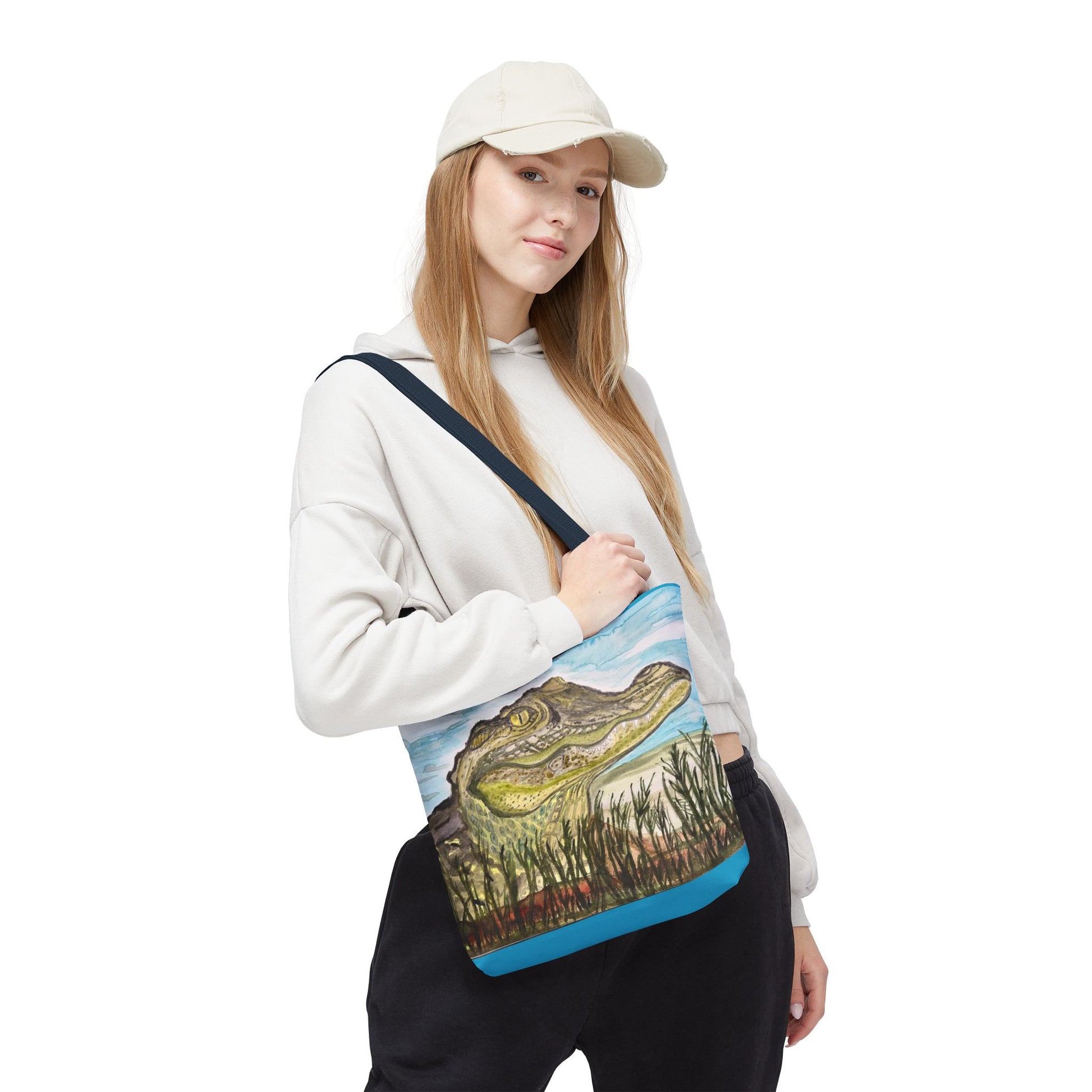 Carry a piece of Texas Gator "Big Padre" marshland whimsy with you every day. This tote brings a hand-painted alligator portrait to life against soft sky blues and reed-lined water, evoking slow summer afternoons by the bayou. It sits comfortably on the shoulder and opens wide for groceries, sketchbooks, or a day's worth of market finds. The art feels personal—a quietly bold companion that starts conversations and reminds the carrier of muddy banks, warm light, and the patient watchfulness of wildlife.